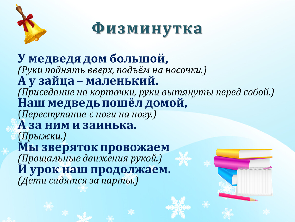 Прозвенел для нас звонок,Начинается урок.К нам без опозданияПриходи, старание.Помоги нам потрудиться,Мы пришли сюда учиться.