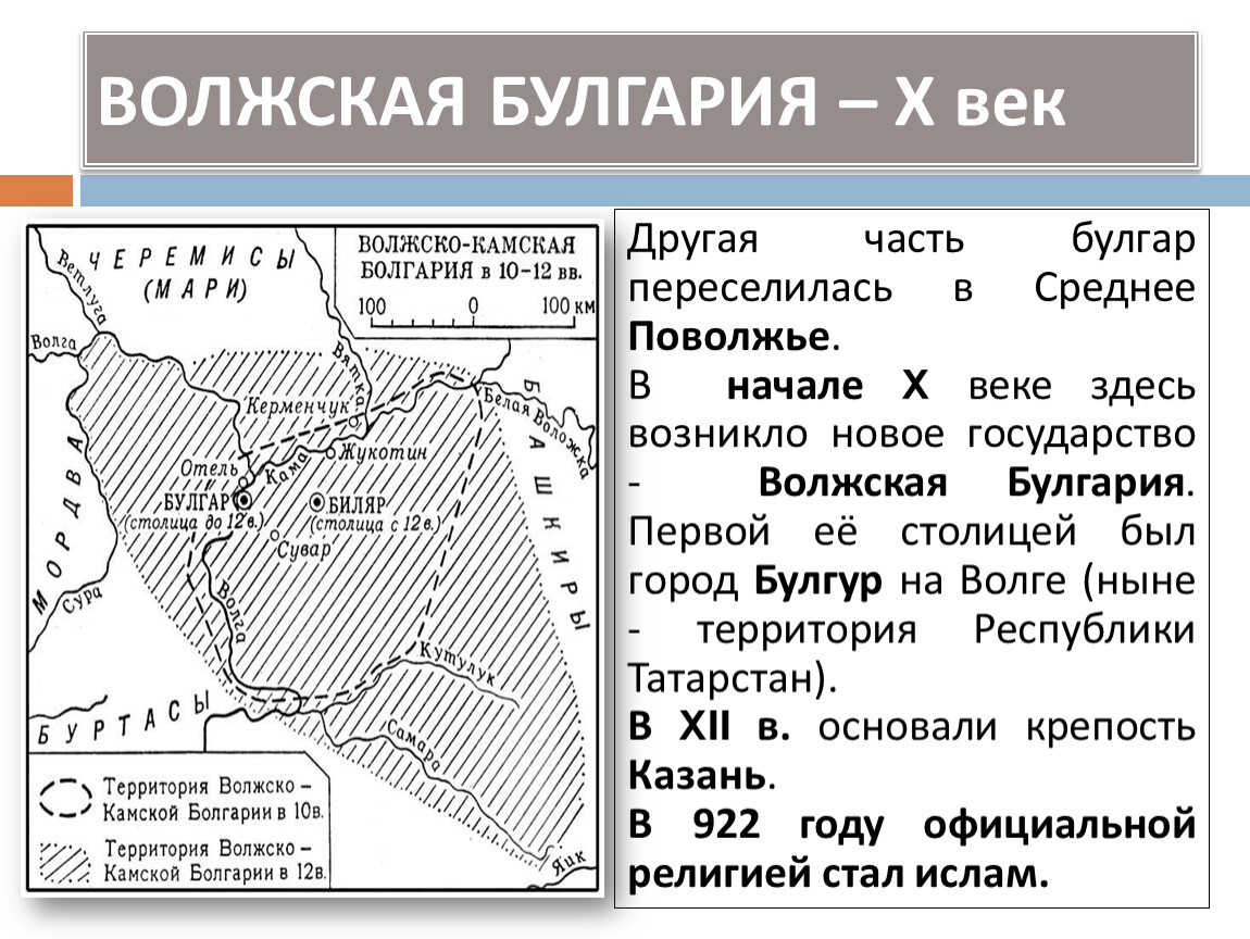 В начале X веке здесь возникло новое государство - Волжская Булгария. Первой её столицей был город Булгур на Волге (ныне - территория Республики Татарстан).