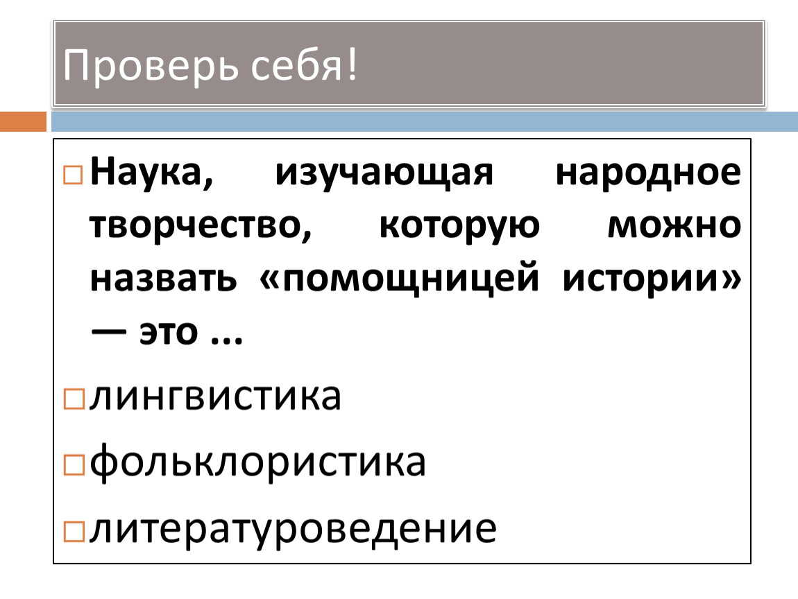 Наука, изучающая народное творчество, которую можно назвать «помощницей истории» — это ...