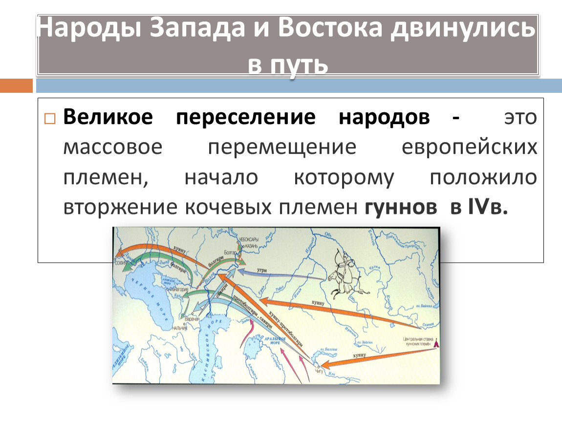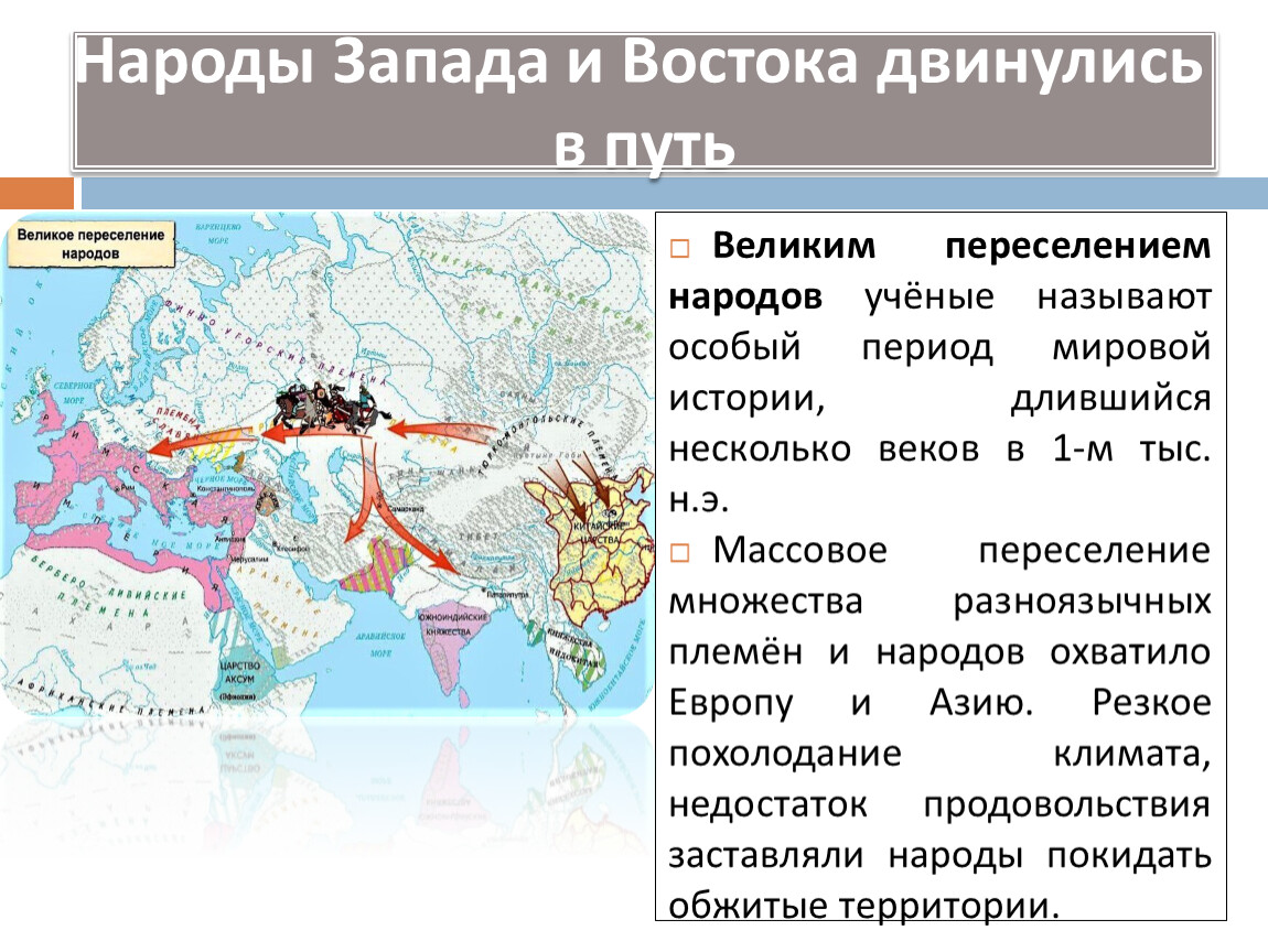 Массовое переселение множества разноязычных племён и народов охватило Европу и Азию. Резкое похолодание климата, недостаток продовольствия заставляли народы покидать обжитые территории.