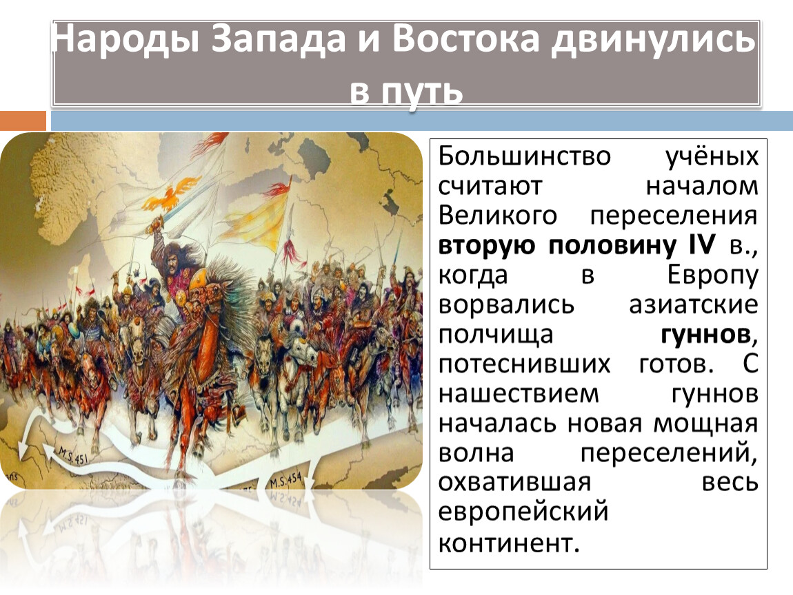 Большинство учёных считают началом Великого переселения вторую половину IV в., когда в Европу ворвались азиатские полчища гуннов, потеснивших готов. С нашествием гуннов началась новая мощная волна переселений, охватившая весь европейский континент.
