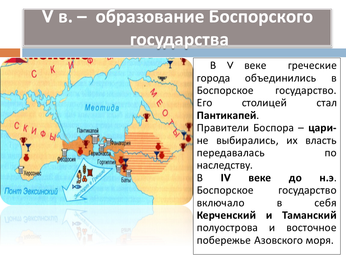 В V веке греческие города объединились в Боспорское государство. Его столицей стал Пантикапей.