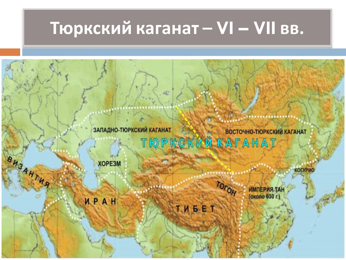 Тюрки, авары, болгары, хазары говорили на языках тюркской группы. Своих правителей они называли каганами. В VI веке у них сложилось своё государство – Тюркский каганат, одно из крупнейших государств в мировой истории. В начале VII в. он распался на Западный и Восточный каганаты.