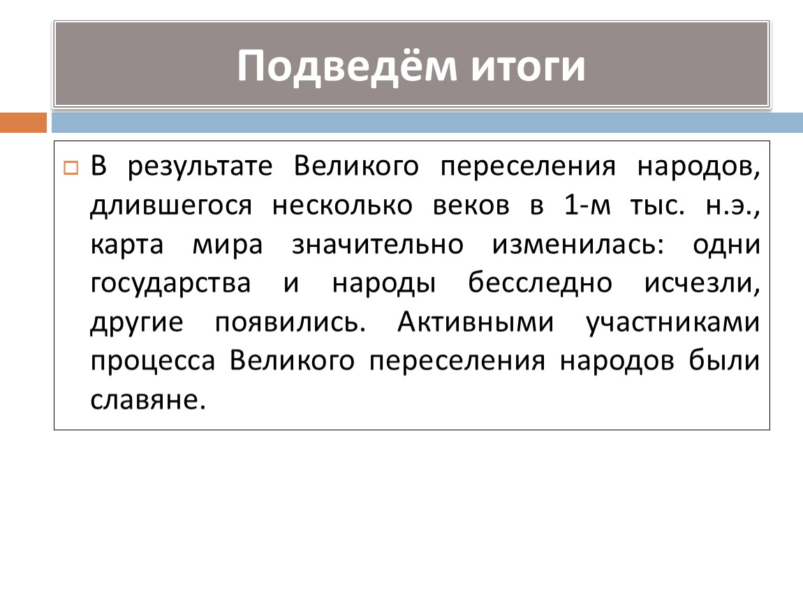 В результате Великого переселения народов, длившегося несколько веков в 1-м тыс. н.э., карта мира значительно изменилась: одни государства и народы бесследно исчезли, другие появились. Активными участниками процесса Великого переселения народов были славяне.