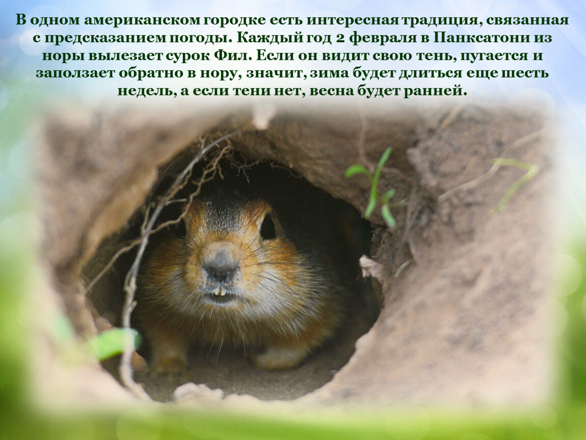 В одном американском городке есть интересная традиция, связанная с предсказанием погоды. Каждый год 2 февраля в Панксатони из норы вылезает сурок Фил. Если он видит свою тень, пугается и заползает обратно в нору, значит, зима будет длиться еще шесть недель, а если тени нет, весна будет ранней.