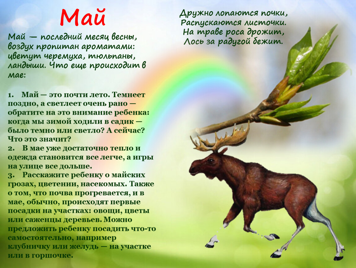 1. Май — это почти лето. Темнеет поздно, а светлеет очень рано — обратите на это внимание ребенка: когда мы зимой ходили в садик — было темно или светло? А сейчас? Что это значит?