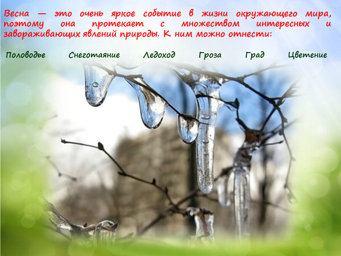 Весна — это очень яркое событие в жизни окружающего мира, поэтому она протекает с множеством интересных и завораживающих явлений природы. К ним можно отнести: