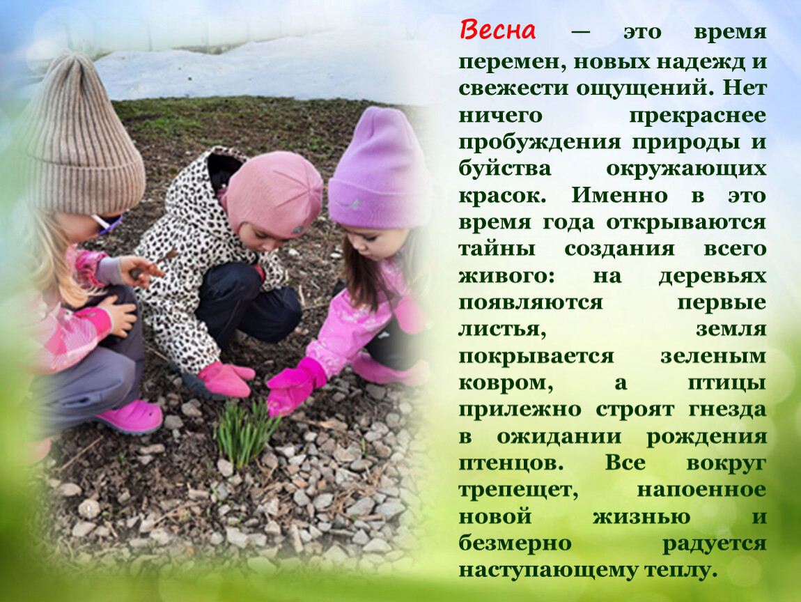 Весна — это время перемен, новых надежд и свежести ощущений. Нет ничего прекраснее пробуждения природы и буйства окружающих красок. Именно в это время года открываются тайны создания всего живого: на деревьях появляются первые листья, земля покрывается зеленым ковром, а птицы прилежно строят гнезда в ожидании рождения птенцов. Все вокруг трепещет, напоенное новой жизнью и безмерно радуется наступающему теплу.