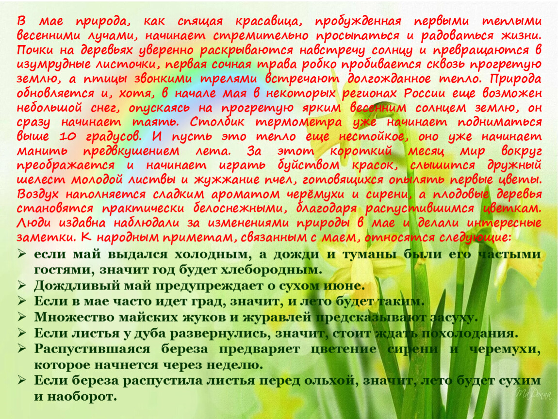 В мае природа, как спящая красавица, пробужденная первыми теплыми весенними лучами, начинает стремительно просыпаться и радоваться жизни. Почки на деревьях уверенно раскрываются навстречу солнцу и превращаются в изумрудные листочки, первая сочная трава робко пробивается сквозь прогретую землю, а птицы звонкими трелями встречают долгожданное тепло. Природа обновляется и, хотя, в начале мая в некоторых регионах России еще возможен небольшой снег, опускаясь на прогретую ярким весенним солнцем землю, он сразу начинает таять. Столбик термометра уже начинает подниматься выше 10 градусов. И пусть это тепло еще нестойкое, оно уже начинает манить предвкушением лета. За этот короткий месяц мир вокруг преображается и начинает играть буйством красок, слышится дружный шелест молодой листвы и жужжание пчел, готовящихся опылять первые цветы. Воздух наполняется сладким ароматом черёмухи и сирени, а плодовые деревья становятся практически белоснежными, благодаря распустившимся цветкам. Люди издавна наблюдали за изменениями природы в мае и делали интересные заметки. К народным приметам, связанным с маем, относятся следующие: