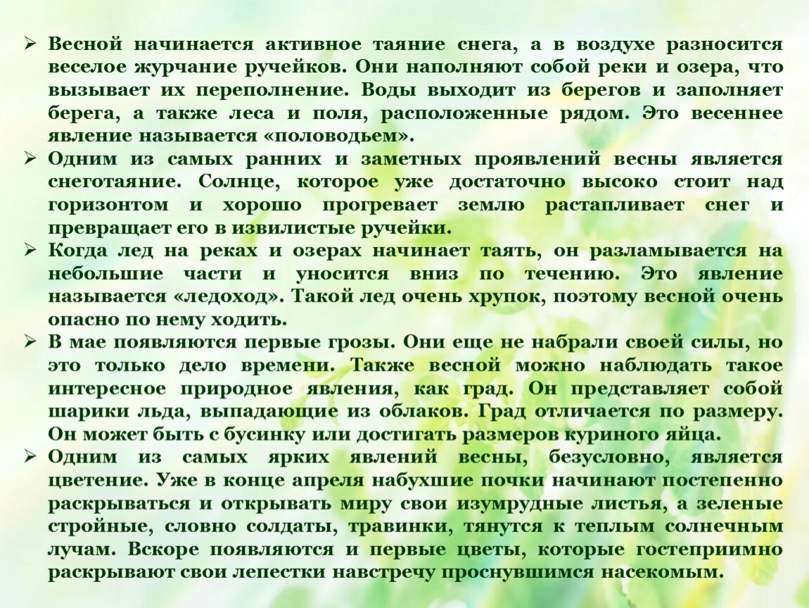 Весной начинается активное таяние снега, а в воздухе разносится веселое журчание ручейков. Они наполняют собой реки и озера, что вызывает их переполнение. Воды выходит из берегов и заполняет берега, а также леса и поля, расположенные рядом. Это весеннее явление называется «половодьем».