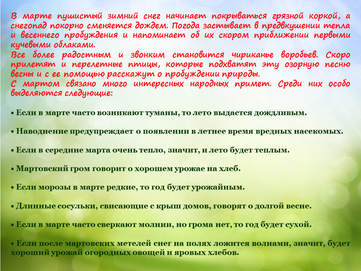 С мартом связано много интересных народных примет. Среди них особо выделяются следующие: