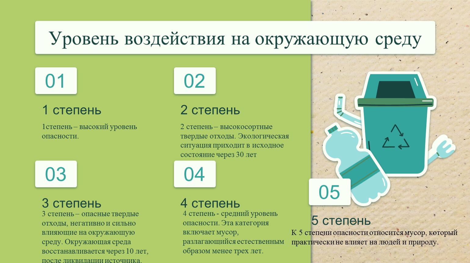 3 степень – опасные твердые отходы, негативно и сильно влияющие на окружающую среду. Окружающая среда восстанавливается через 10 лет, после ликвидации источника.