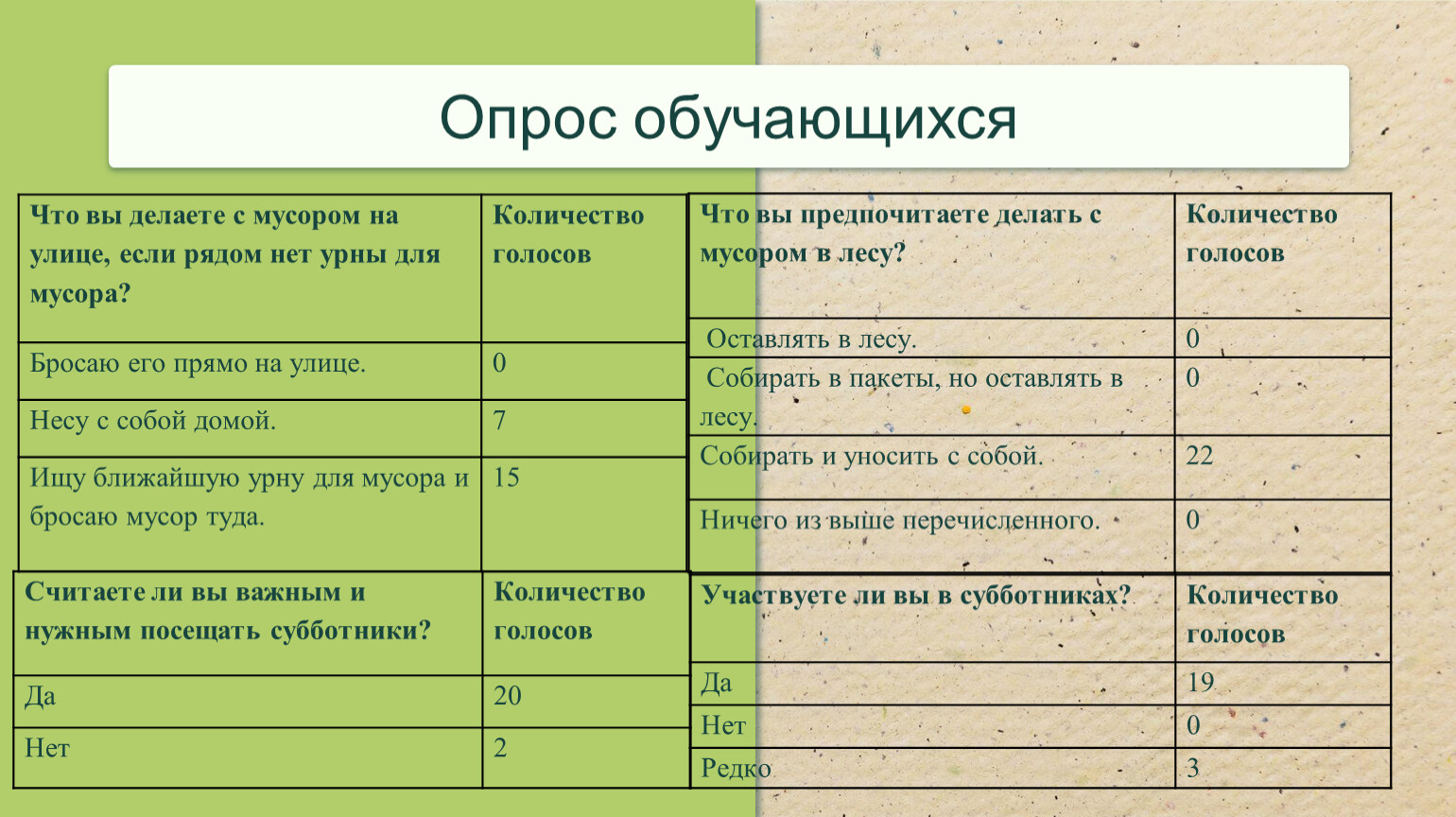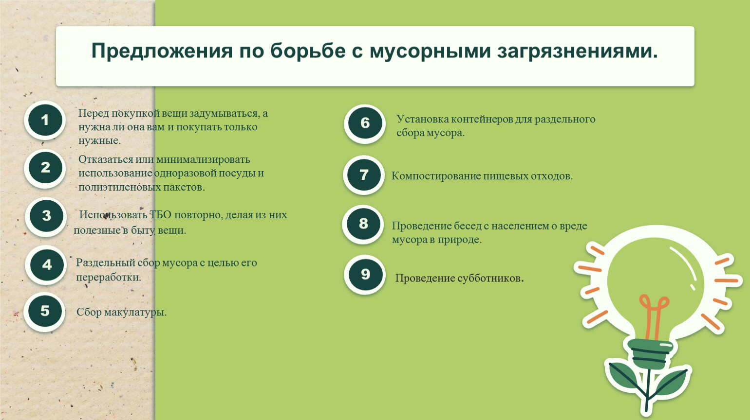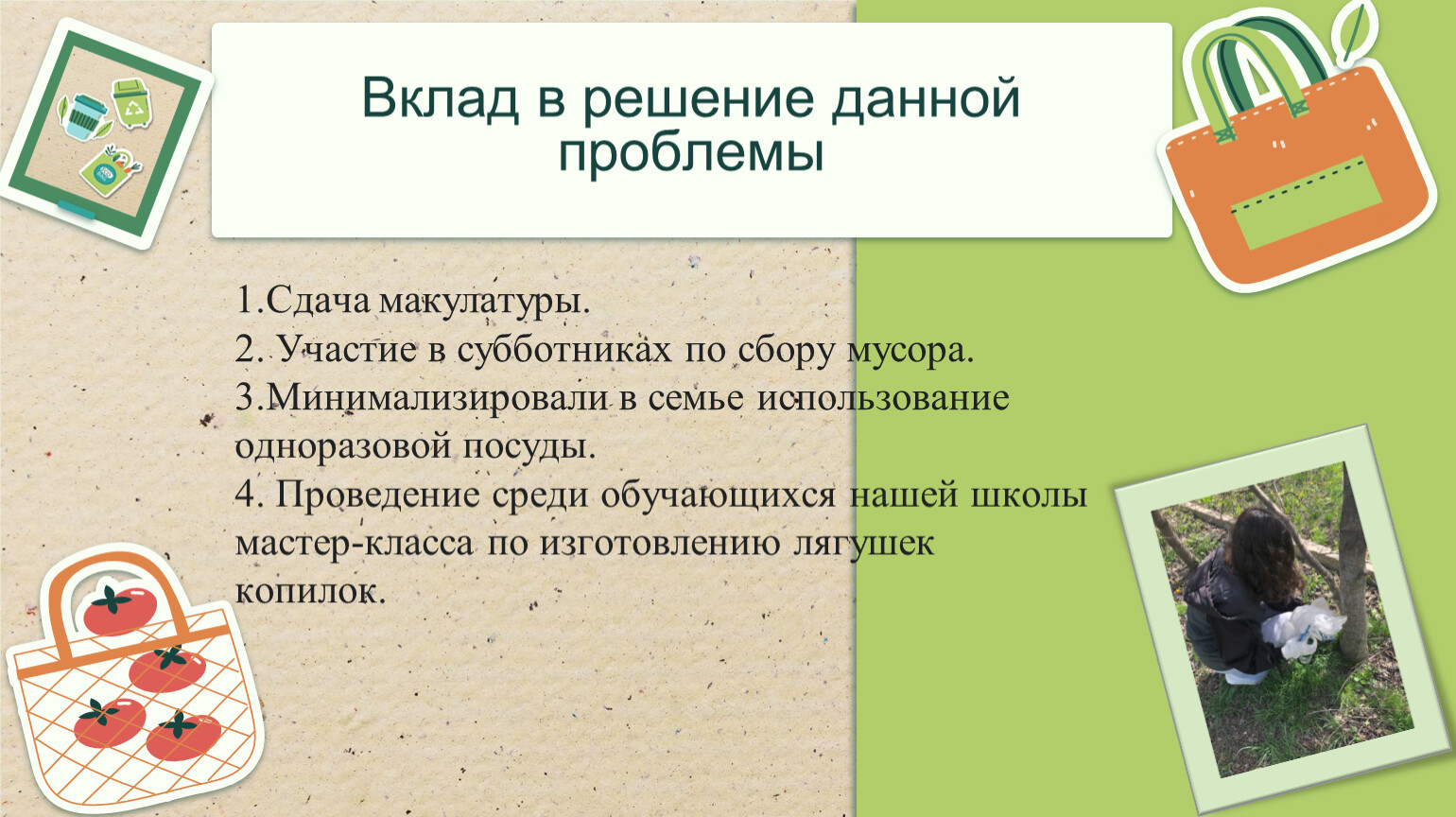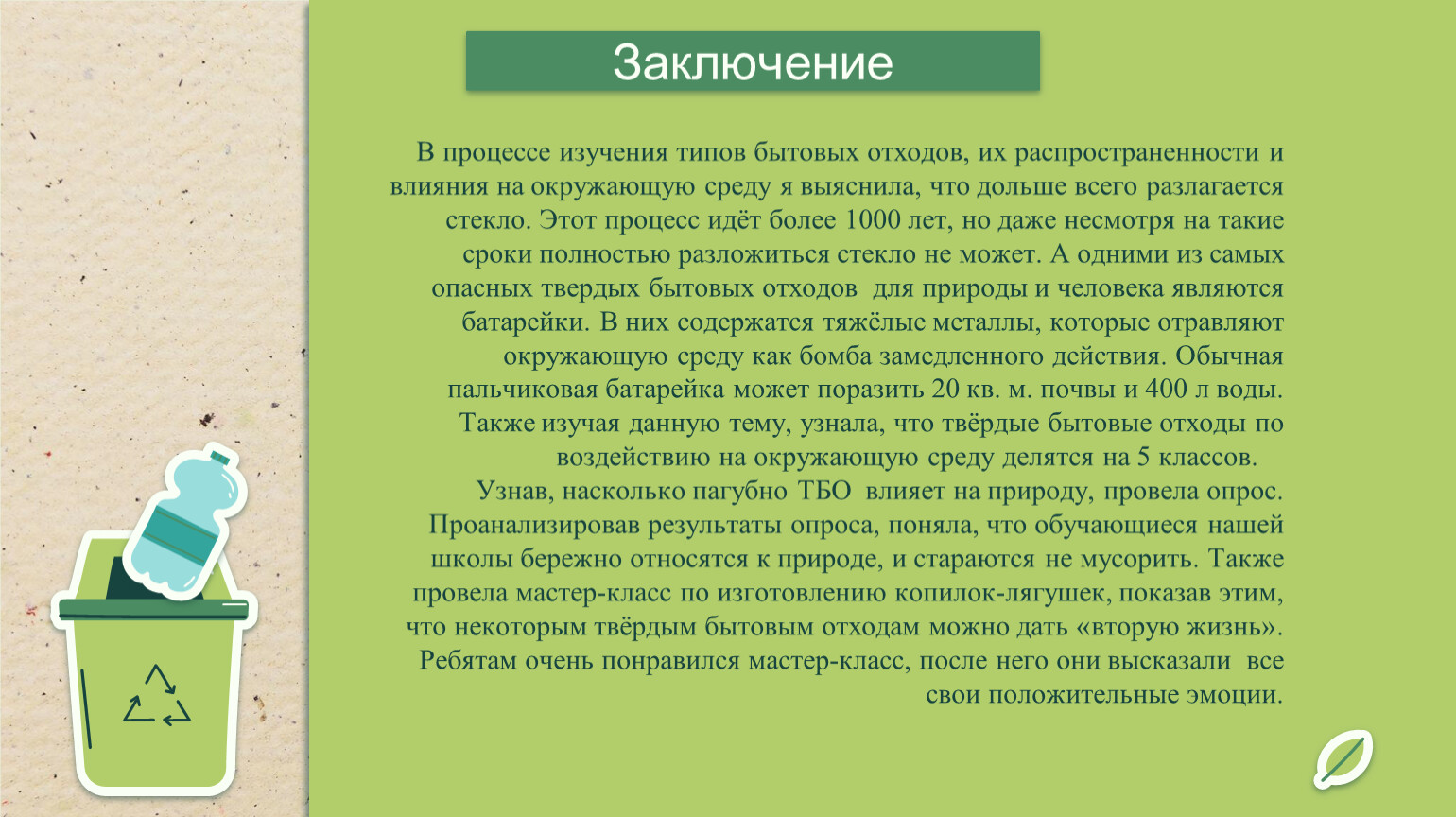 Узнав, насколько пагубно ТБО влияет на природу, провела опрос. Проанализировав результаты опроса, поняла, что обучающиеся нашей школы бережно относятся к природе, и стараются не мусорить. Также провела мастер-класс по изготовлению копилок-лягушек, показав этим, что некоторым твёрдым бытовым отходам можно дать «вторую жизнь». Ребятам очень понравился мастер-класс, после него они высказали все свои положительные эмоции.