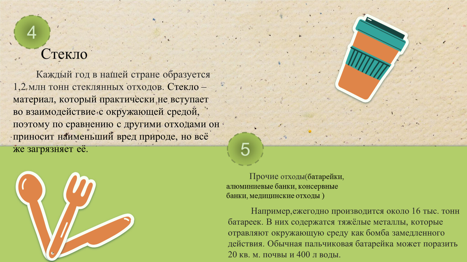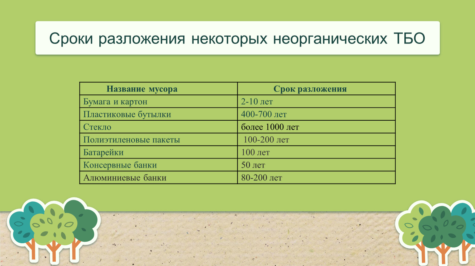 В процессе изучения типов бытовых отходов, их распространенности и влияния на окружающую среду я выяснила, что дольше всего разлагается стекло. Этот процесс идёт более 1000 лет, но даже несмотря на такие сроки полностью разложиться стекло не может. А одними из самых опасных твердых бытовых отходов для природы и человека являются батарейки. В них содержатся тяжёлые металлы, которые отравляют окружающую среду как бомба замедленного действия. Обычная пальчиковая батарейка может поразить 20 кв. м. почвы и 400 л воды. Также изучая данную тему, узнала, что твёрдые бытовые отходы по воздействию на окружающую среду делятся на 5 классов.