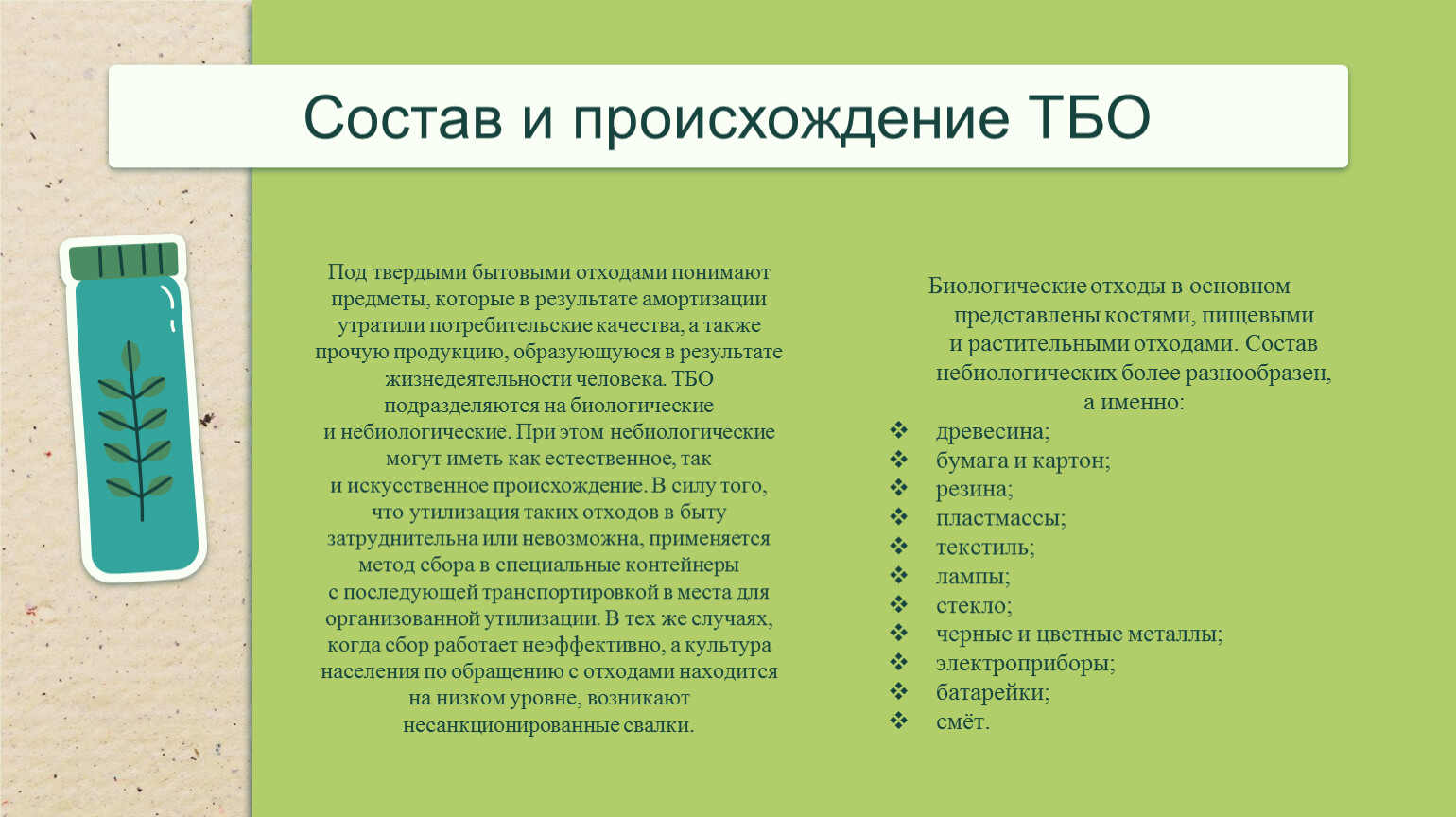 Биологические отходы в основном представлены костями, пищевыми и растительными отходами. Состав небиологических более разнообразен, а именно: