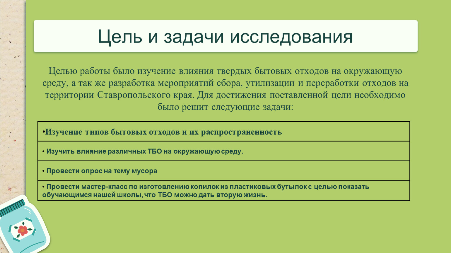 Целью работы было изучение влияния твердых бытовых отходов на окружающую среду, а так же разработка мероприятий сбора, утилизации и переработки отходов на территории Ставропольского края. Для достижения поставленной цели необходимо было решит следующие задачи: