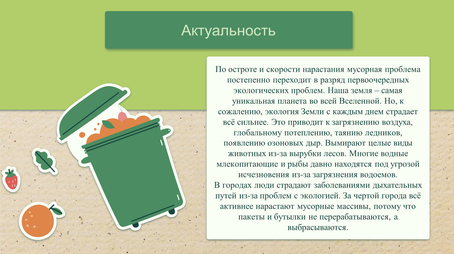 По остроте и скорости нарастания мусорная проблема постепенно переходит в разряд первоочередных экологических проблем. Наша земля – самая уникальная планета во всей Вселенной. Но, к сожалению, экология Земли с каждым днем страдает всё сильнее. Это приводит к загрязнению воздуха, глобальному потеплению, таянию ледников, появлению озоновых дыр. Вымирают целые виды животных из-за вырубки лесов. Многие водные млекопитающие и рыбы давно находятся под угрозой исчезновения из-за загрязнения водоемов.В городах люди страдают заболеваниями дыхательных путей из-за проблем с экологией. За чертой города всё активнее нарастают мусорные массивы, потому что пакеты и бутылки не перерабатываются, а выбрасываются.