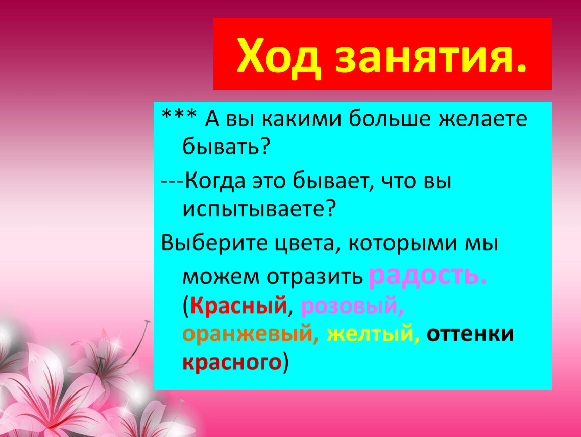 Выберите цвета, которыми мы можем отразить радость.(Красный, розовый, оранжевый, желтый, оттенки красного)