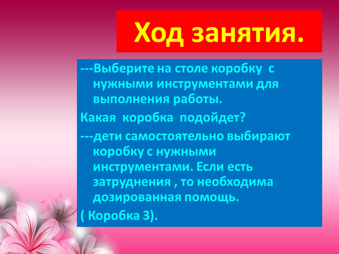 ---дети самостоятельно выбирают коробку с нужными инструментами. Если есть затруднения , то необходима дозированная помощь.