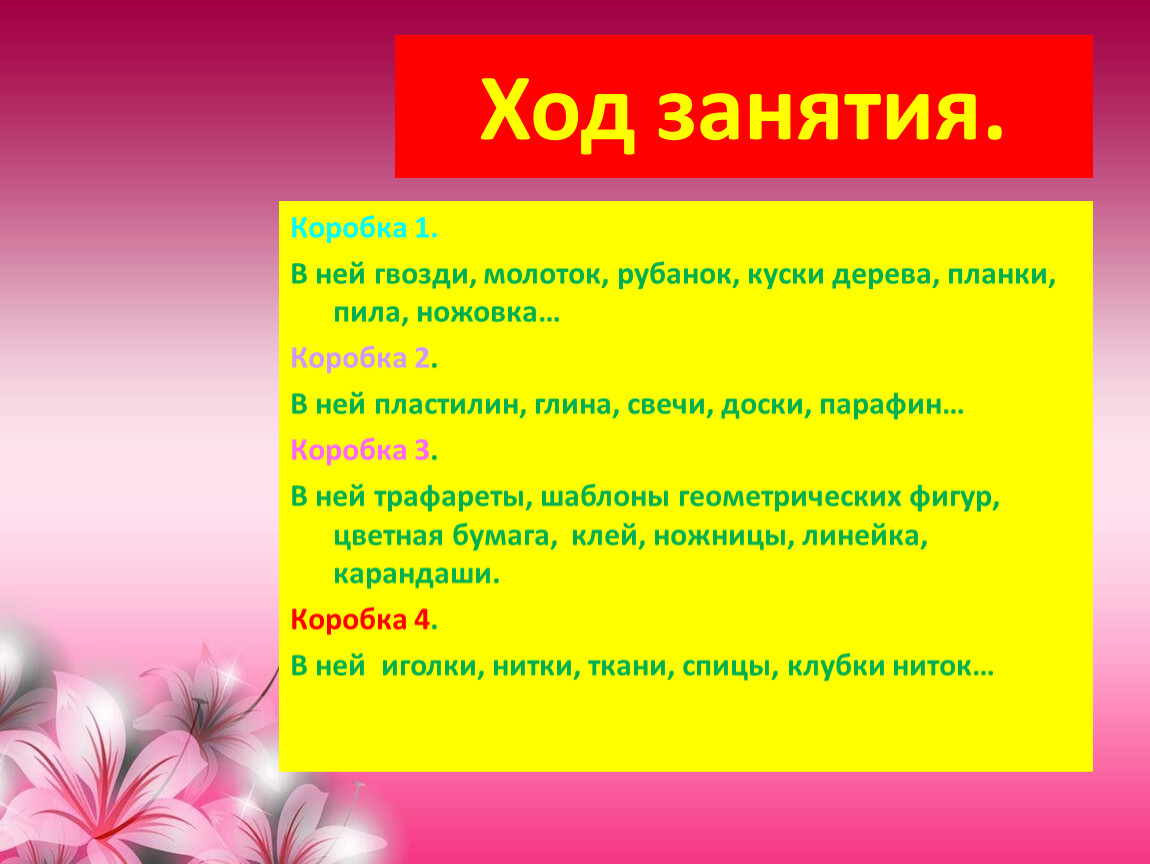 (На столе 4 коробки, в каждой инструменты).
