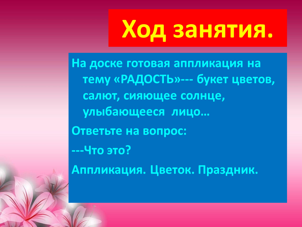 На доске готовая аппликация на тему «РАДОСТЬ»--- букет цветов, салют, сияющее солнце, улыбающееся лицо…