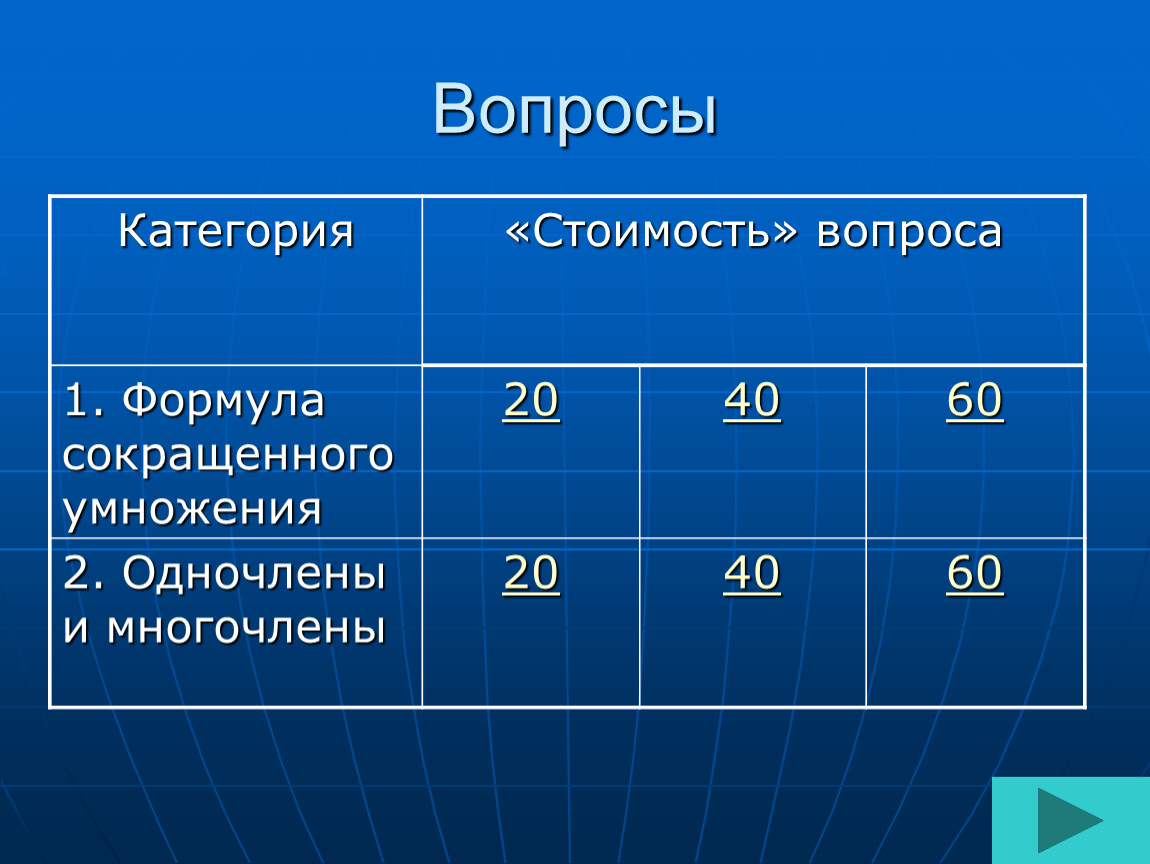 Категории | «Стоимость» вопросов | ||||