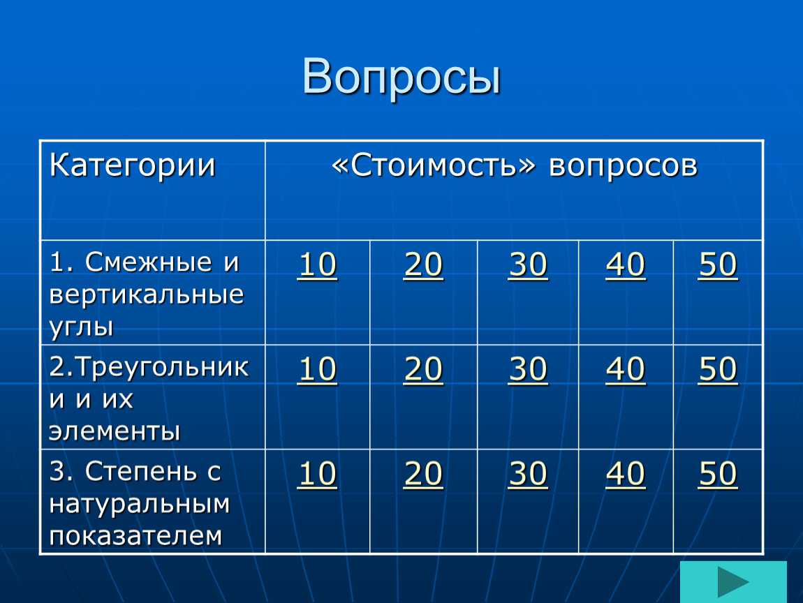 1. Смежные и вертикальные углы | 10 | 20 | 30 | 40 | 50 |