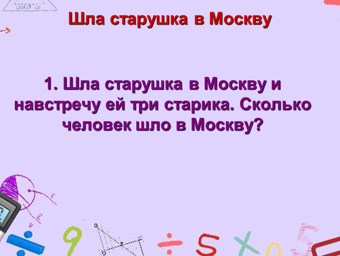 1. Шла старушка в Москву и навстречу ей три старика. Сколько человек шло в Москву?