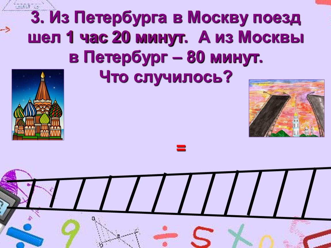 3. Из Петербурга в Москву поезд шел 1 час 20 минут. А из Москвы в Петербург – 80 минут. Что случилось?