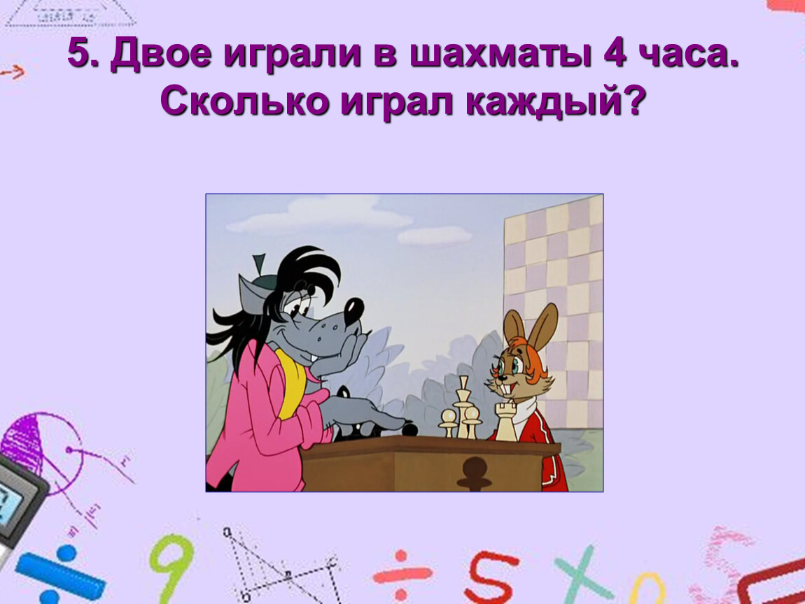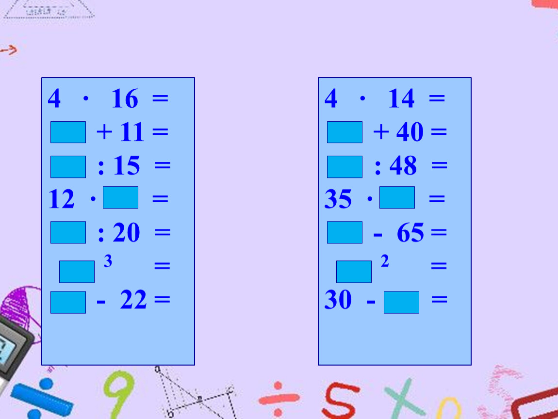 На доске для каждой команды написаны примеры. Каждый следующий участник, начиная со второго, записывает ответ предыдущего участника в и продолжает вычисления.