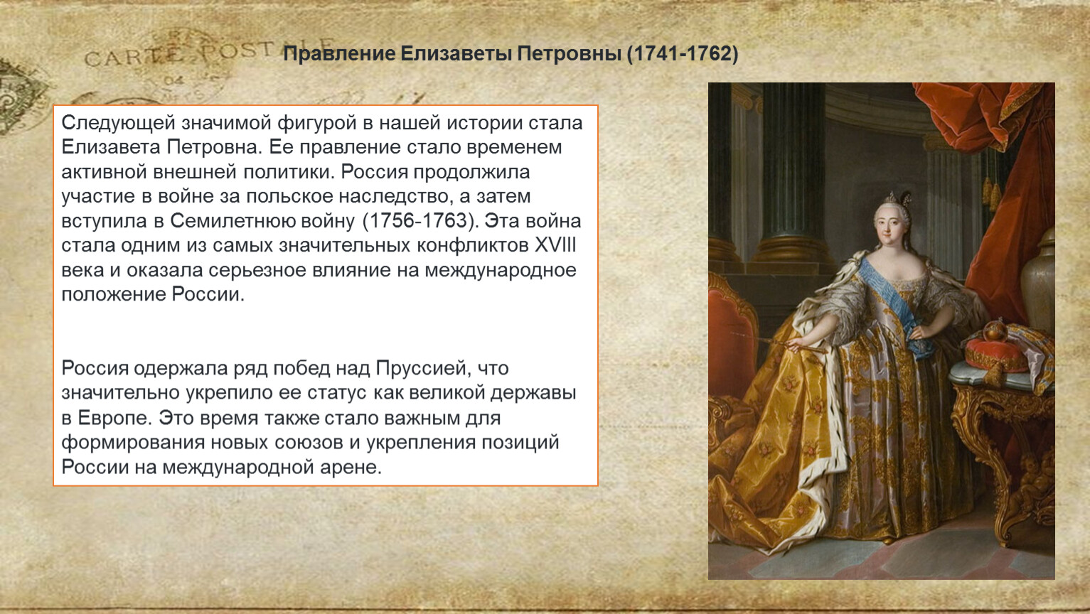 Следующей значимой фигурой в нашей истории стала Елизавета Петровна. Ее правление стало временем активной внешней политики. Россия продолжила участие в войне за польское наследство, а затем вступила в Семилетнюю войну (1756-1763). Эта война стала одним из самых значительных конфликтов XVIII века и оказала серьезное влияние на международное положение России.