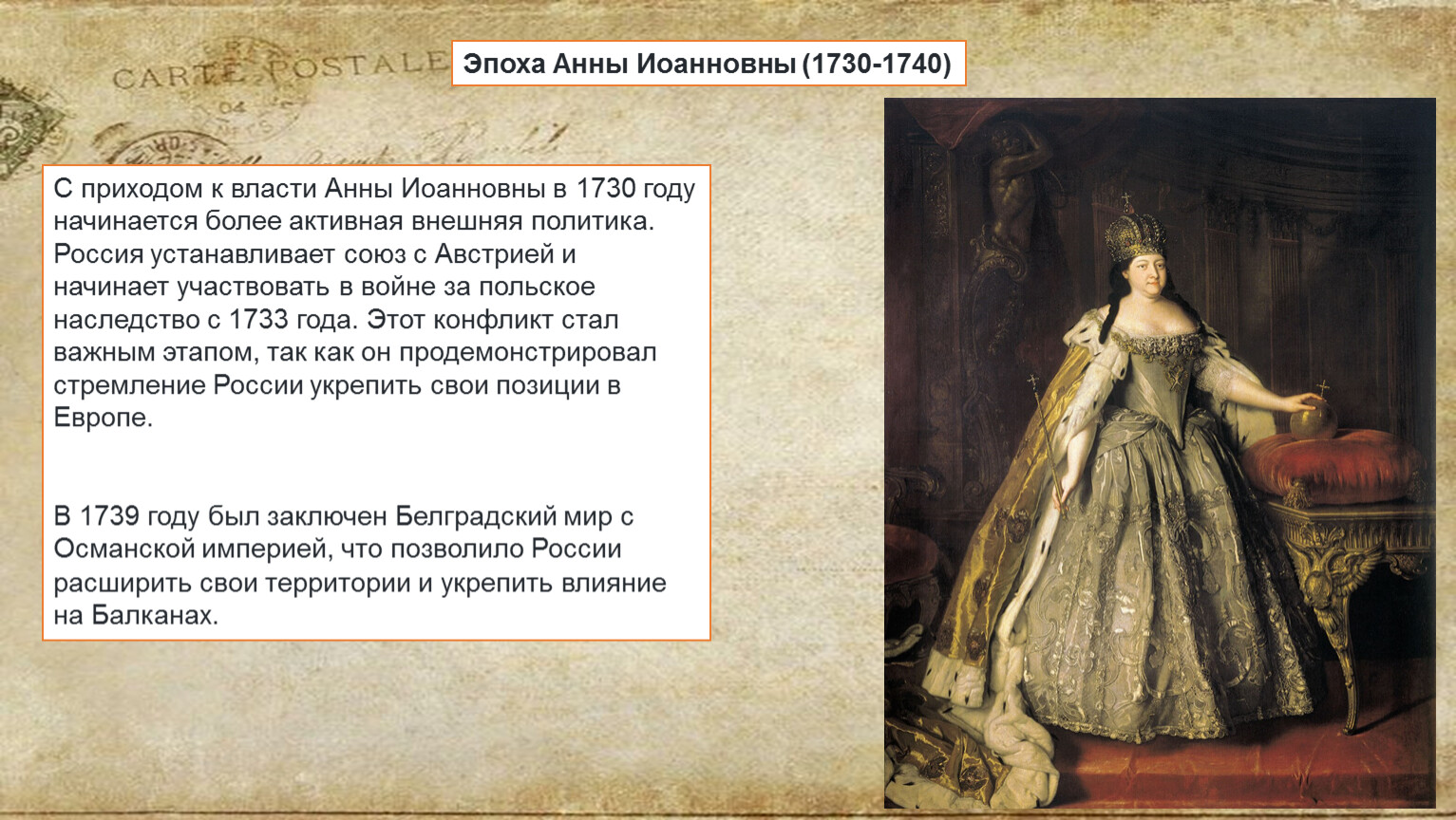 С приходом к власти Анны Иоанновны в 1730 году начинается более активная внешняя политика. Россия устанавливает союз с Австрией и начинает участвовать в войне за польское наследство с 1733 года. Этот конфликт стал важным этапом, так как он продемонстрировал стремление России укрепить свои позиции в Европе.