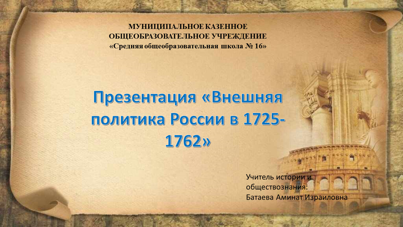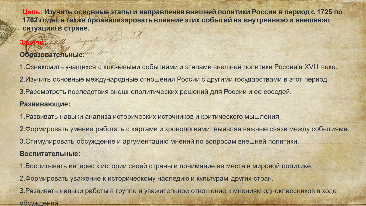 Цель: Изучить основные этапы и направления внешней политики России в период с 1725 по 1762 годы, а также проанализировать влияние этих событий на внутреннюю и внешнюю ситуацию в стране.