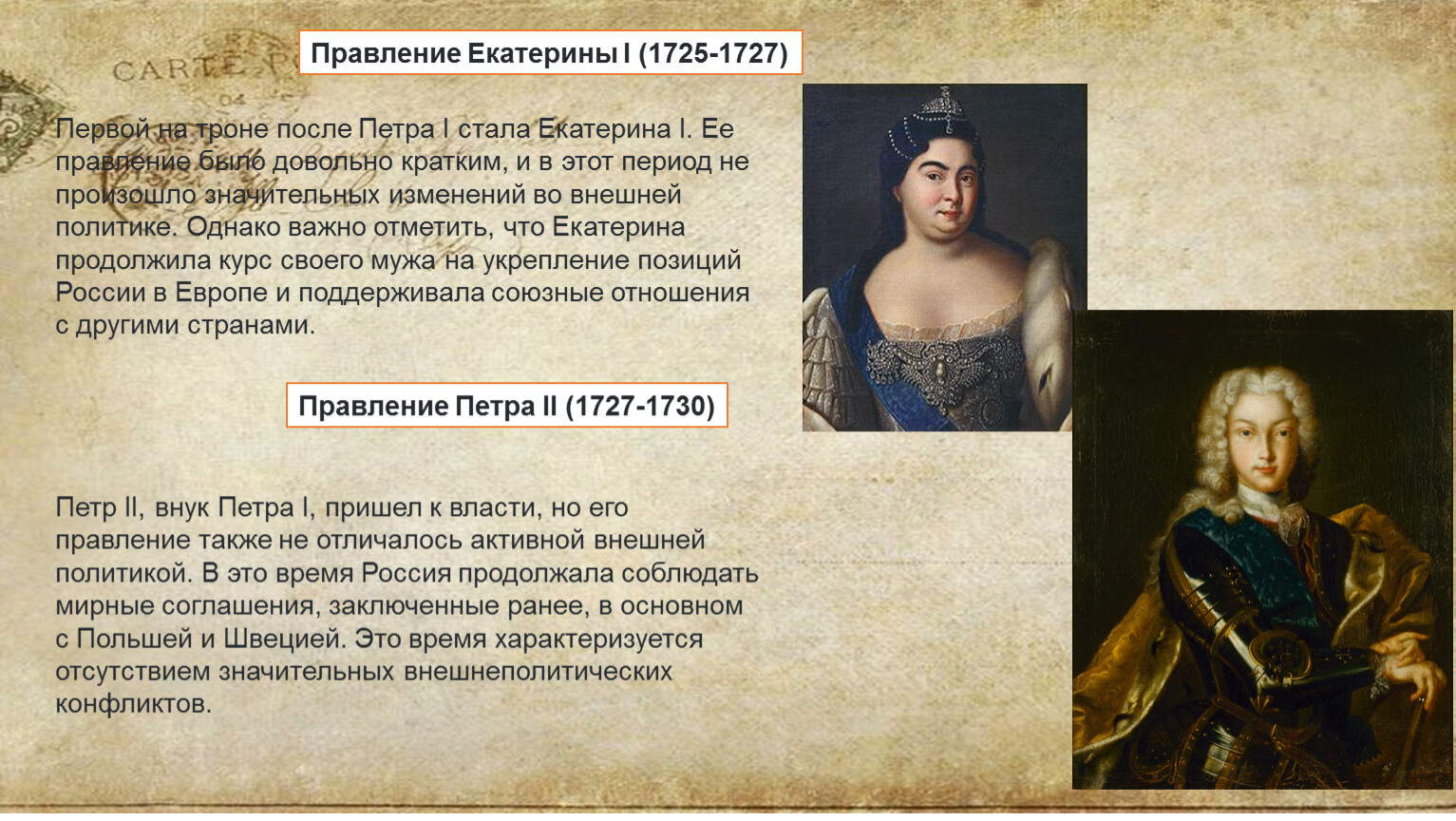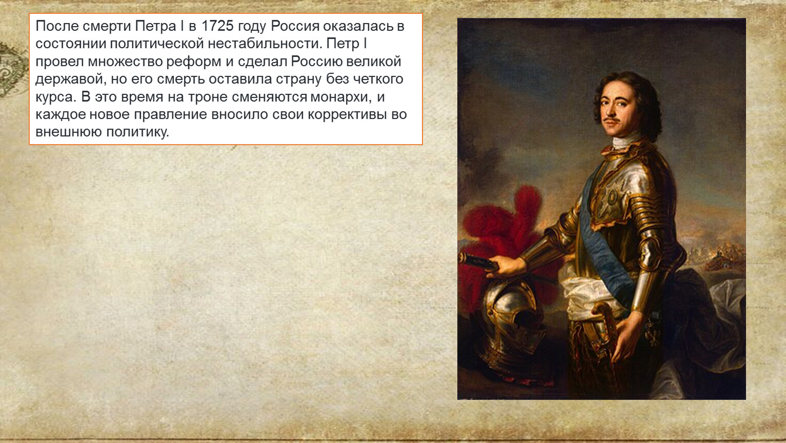 После смерти Петра I в 1725 году Россия оказалась в состоянии политической нестабильности. Петр I провел множество реформ и сделал Россию великой державой, но его смерть оставила страну без четкого курса. В это время на троне сменяются монархи, и каждое новое правление вносило свои коррективы во внешнюю политику.