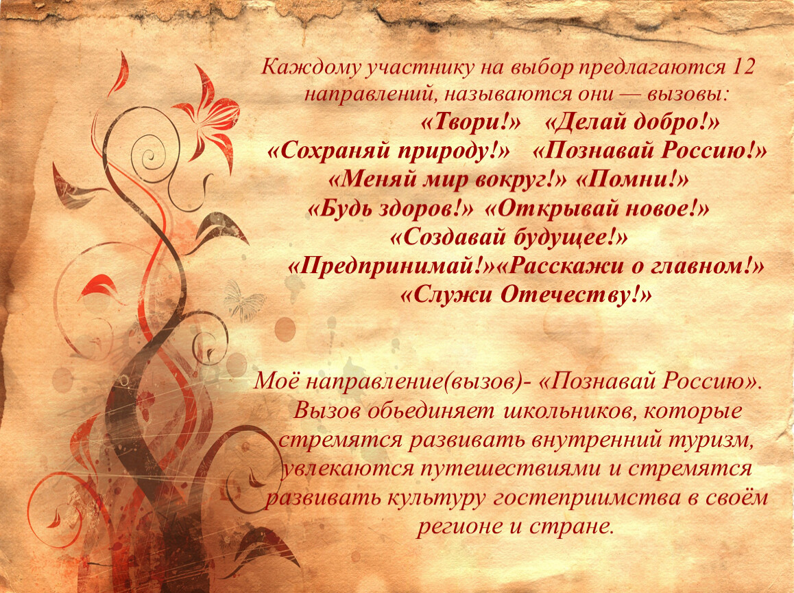 Моё направление(вызов)- «Познавай Россию». Вызов обьединяет школьников, которые стремятся развивать внутренний туризм, увлекаются путешествиями и стремятся развивать культуру гостеприимства в своём регионе и стране.