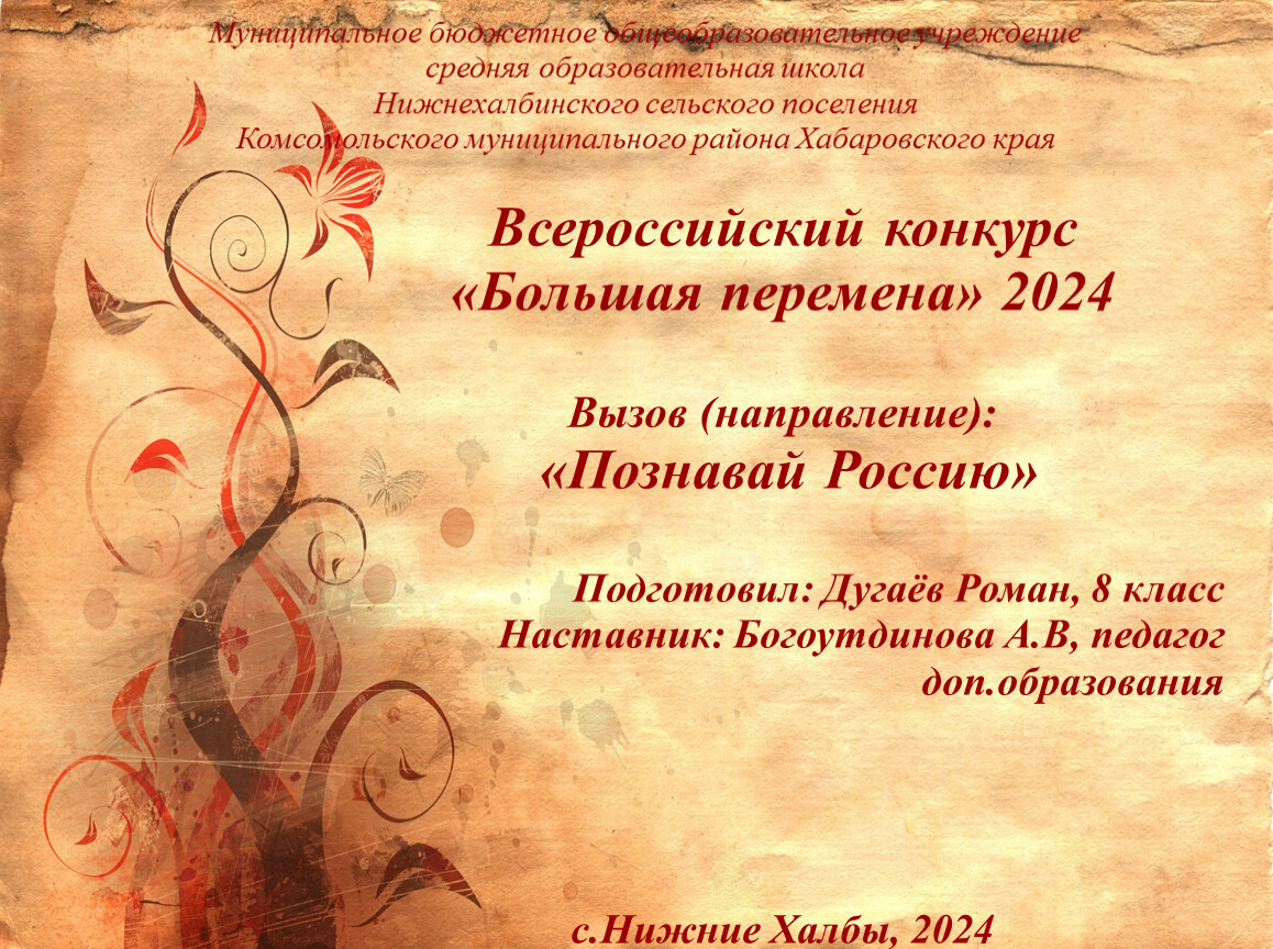Муниципальное бюджетное общеобразовательное учреждение средняя образовательная школаНижнехалбинского сельского поселенияКомсомольского муниципального района Хабаровского края