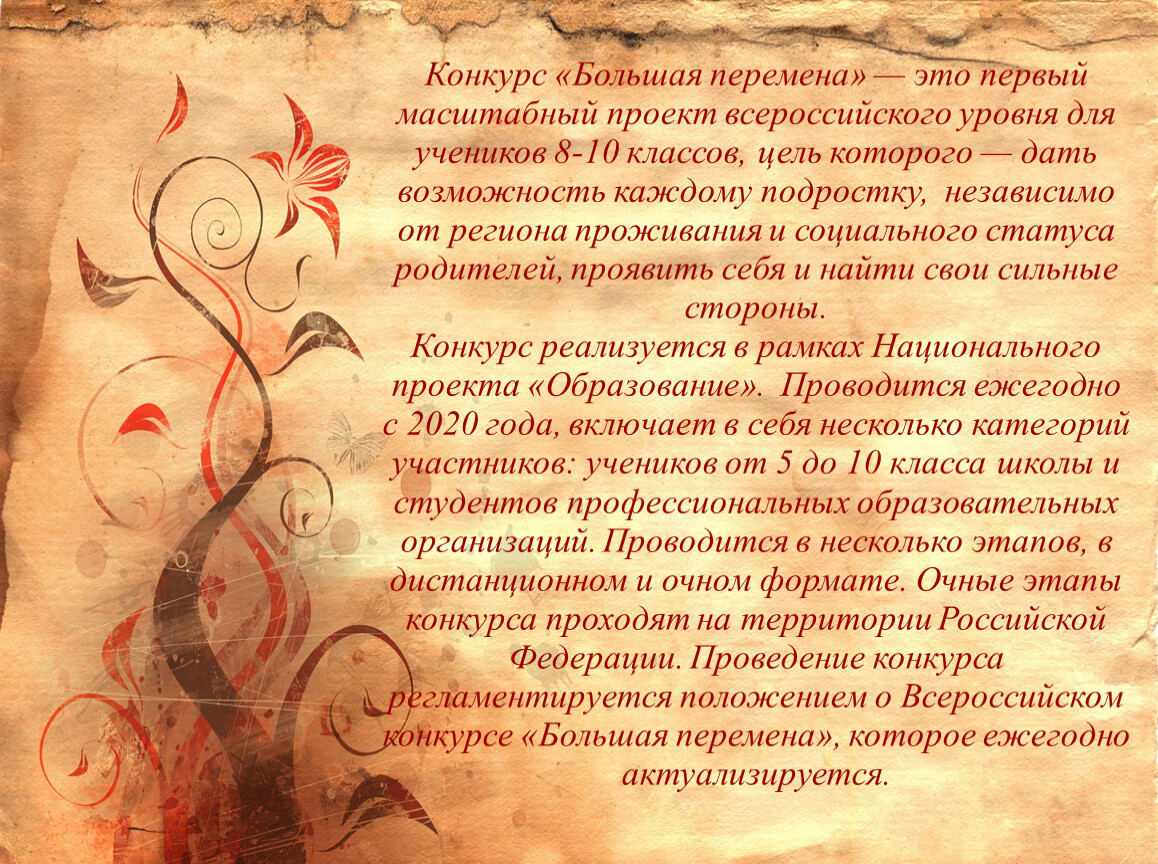 Конкурс «Большая перемена» — это первый масштабный проект всероссийского уровня для учеников 8-10 классов, цель которого — дать возможность каждому подростку, независимо от региона проживания и социального статуса родителей, проявить себя и найти свои сильные стороны.