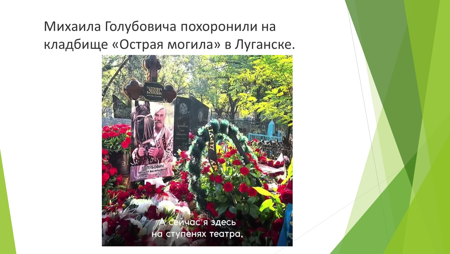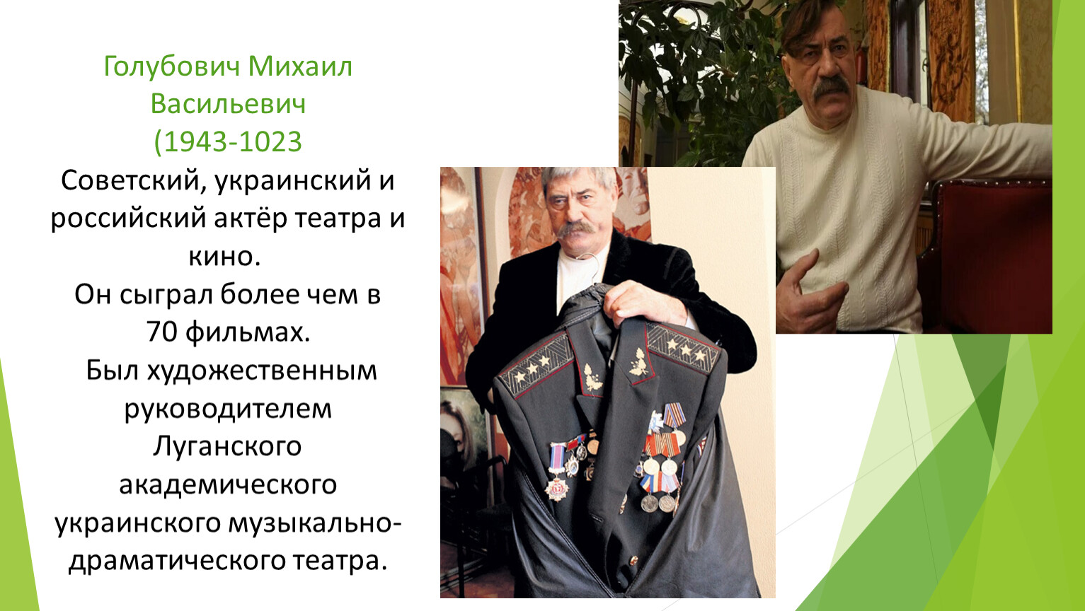 Голубович Михаил Васильевич(1943-1023 Советский, украинский и российский актёр театра и кино. Он сыграл более чем в 70 фильмах. Был художественным руководителем Луганского академического украинского музыкально-драматического театра.