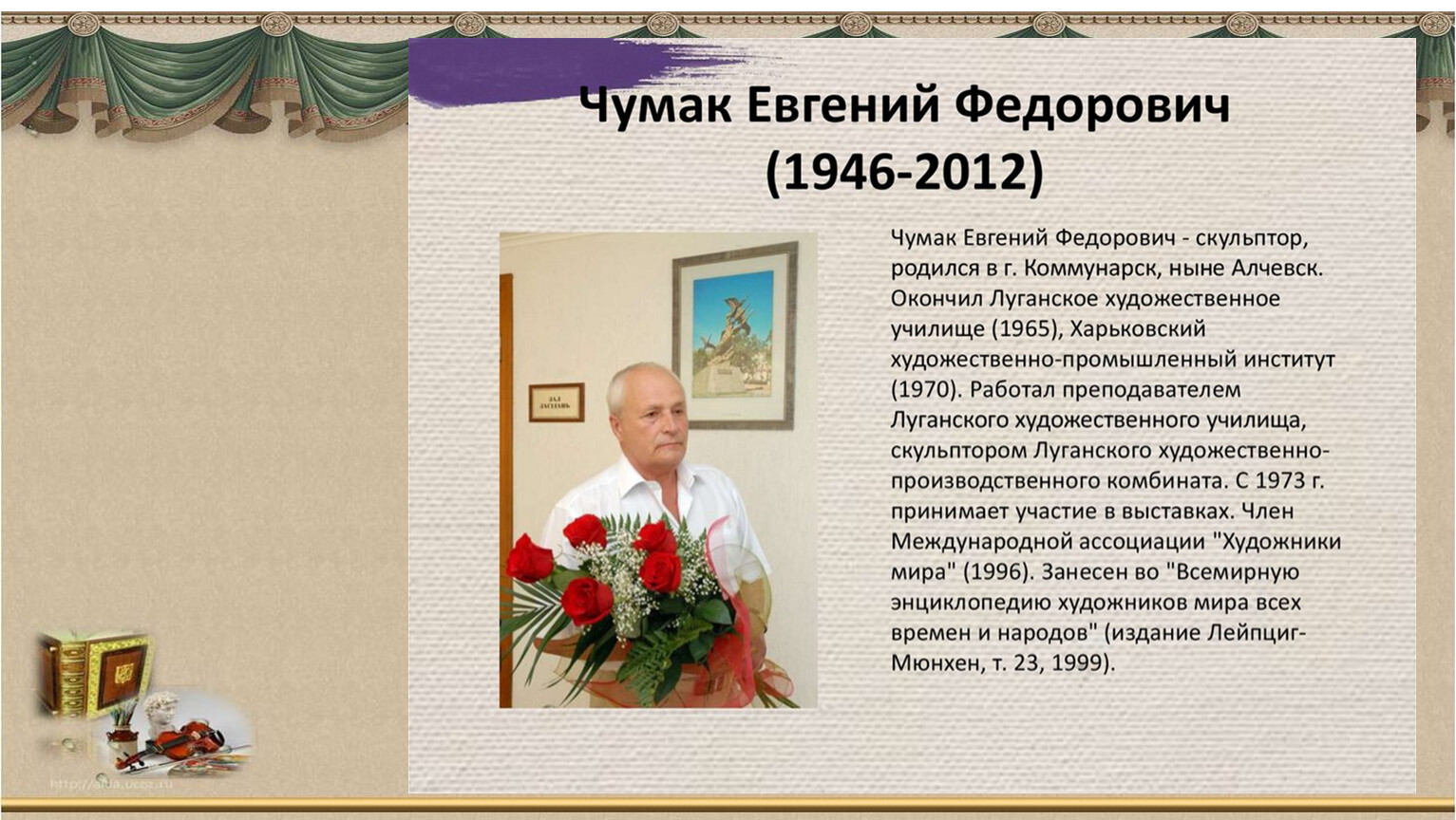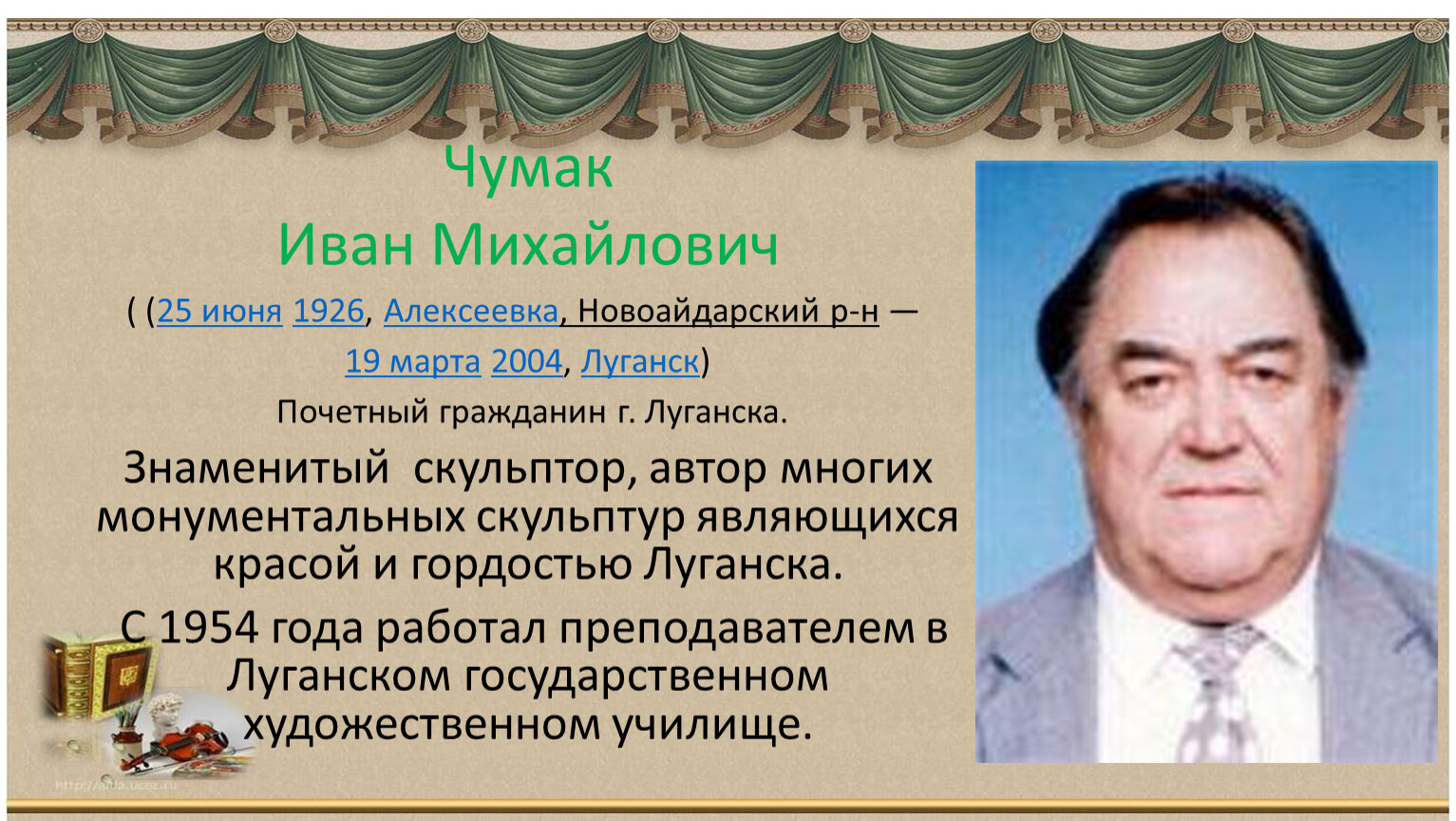 Знаменитый скульптор, автор многих монументальных скульптур являющихся красой и гордостью Луганска.