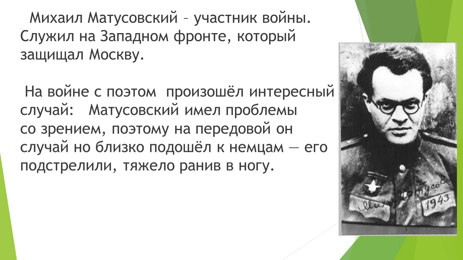 Михаил Матусовский – участник войны. Служил на Западном фронте, который защищал Москву. На войне с поэтом произошёл интересный случай: Матусовский имел проблемы со зрением, поэтому на передовой он случай но близко подошёл к немцам — его подстрелили, тяжело ранив в ногу.