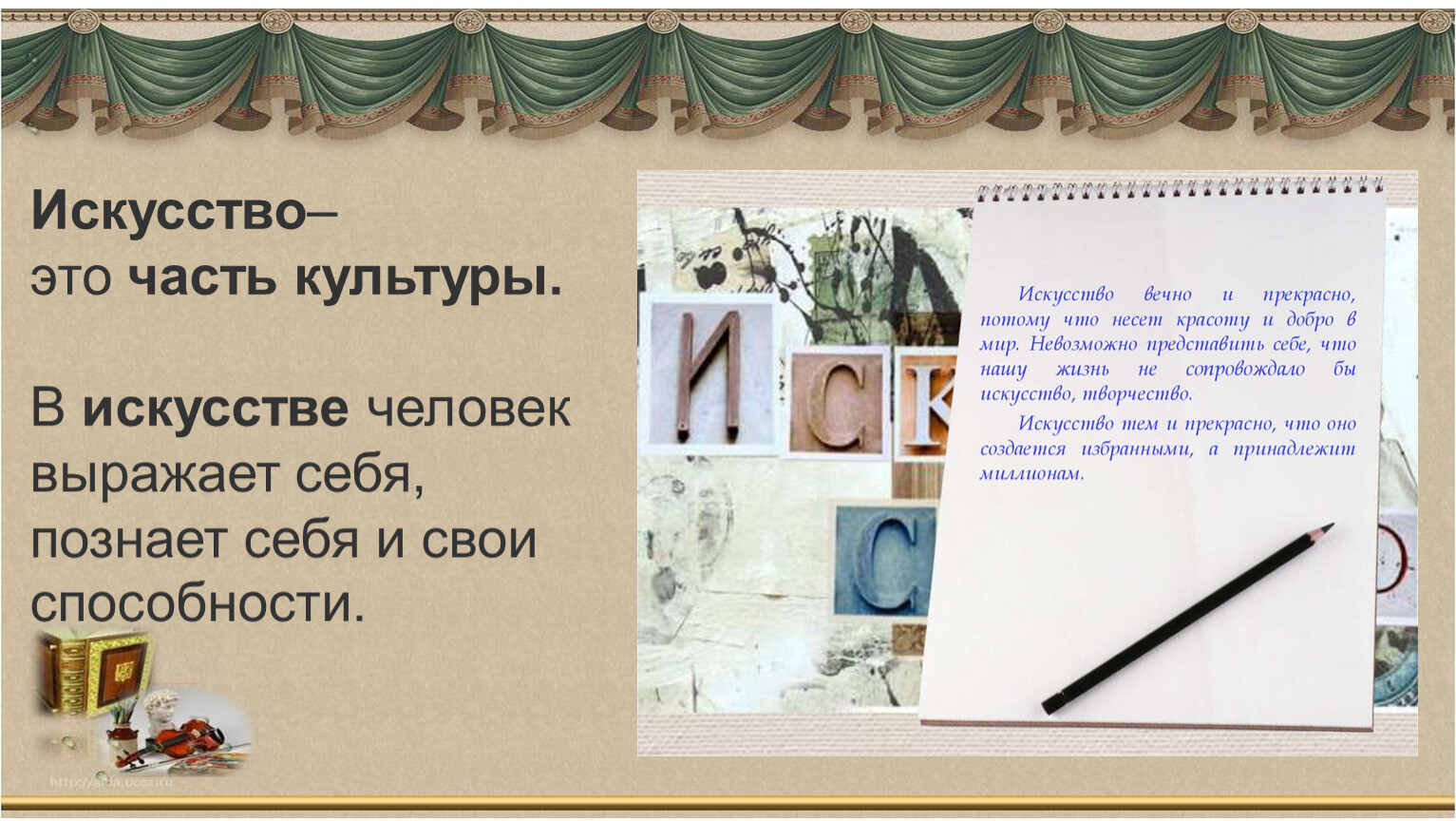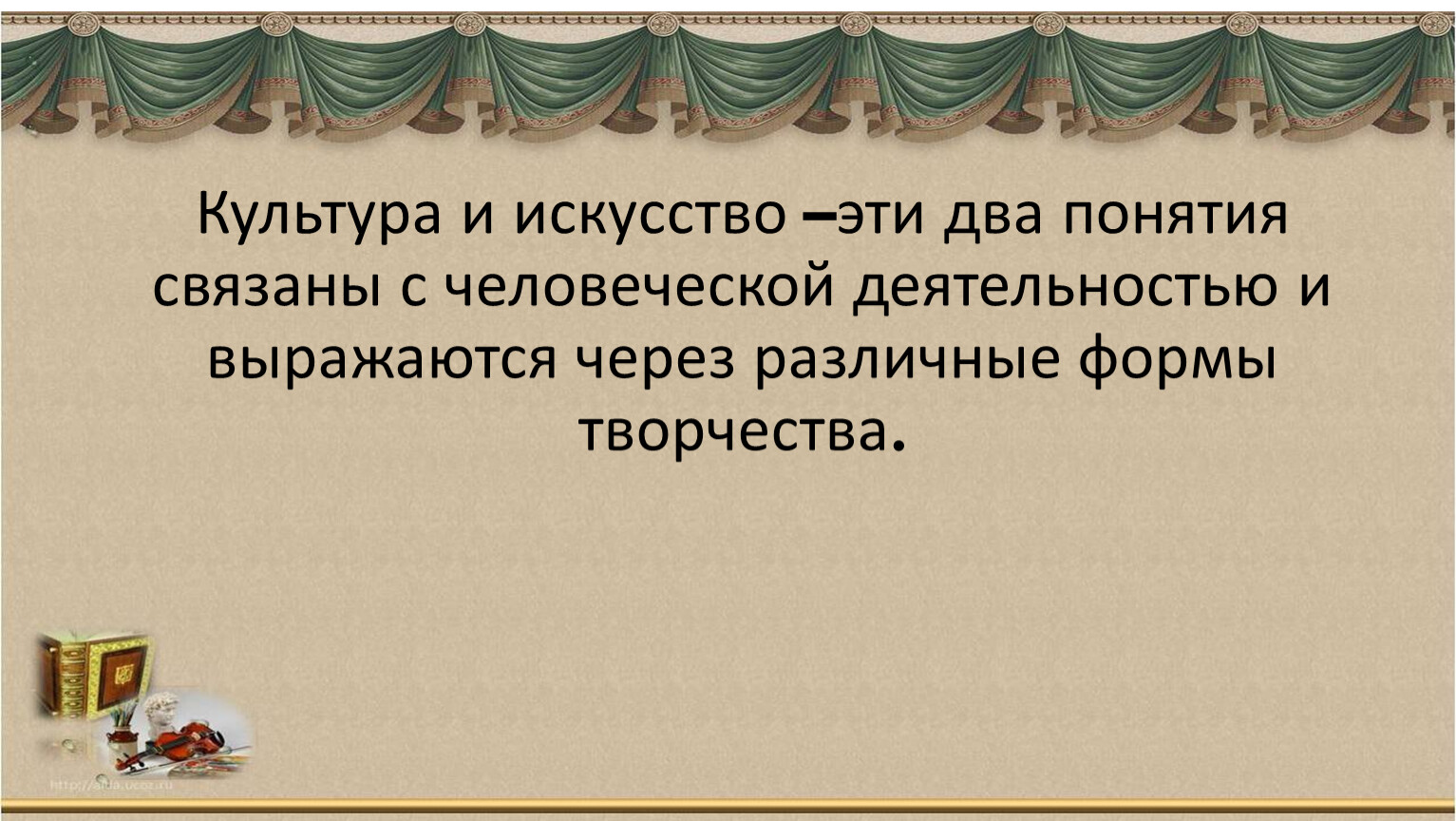 Культура и искусство –эти два понятия связаны с человеческой деятельностью и выражаются через различные формы творчества.