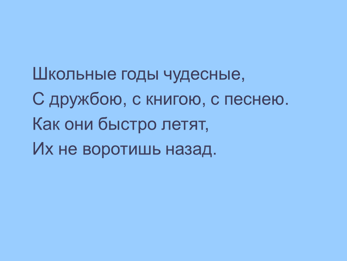 Школьные годы чудесные, С дружбою, с книгою, с песнею. Как они быстро летят, Их не воротишь назад.
