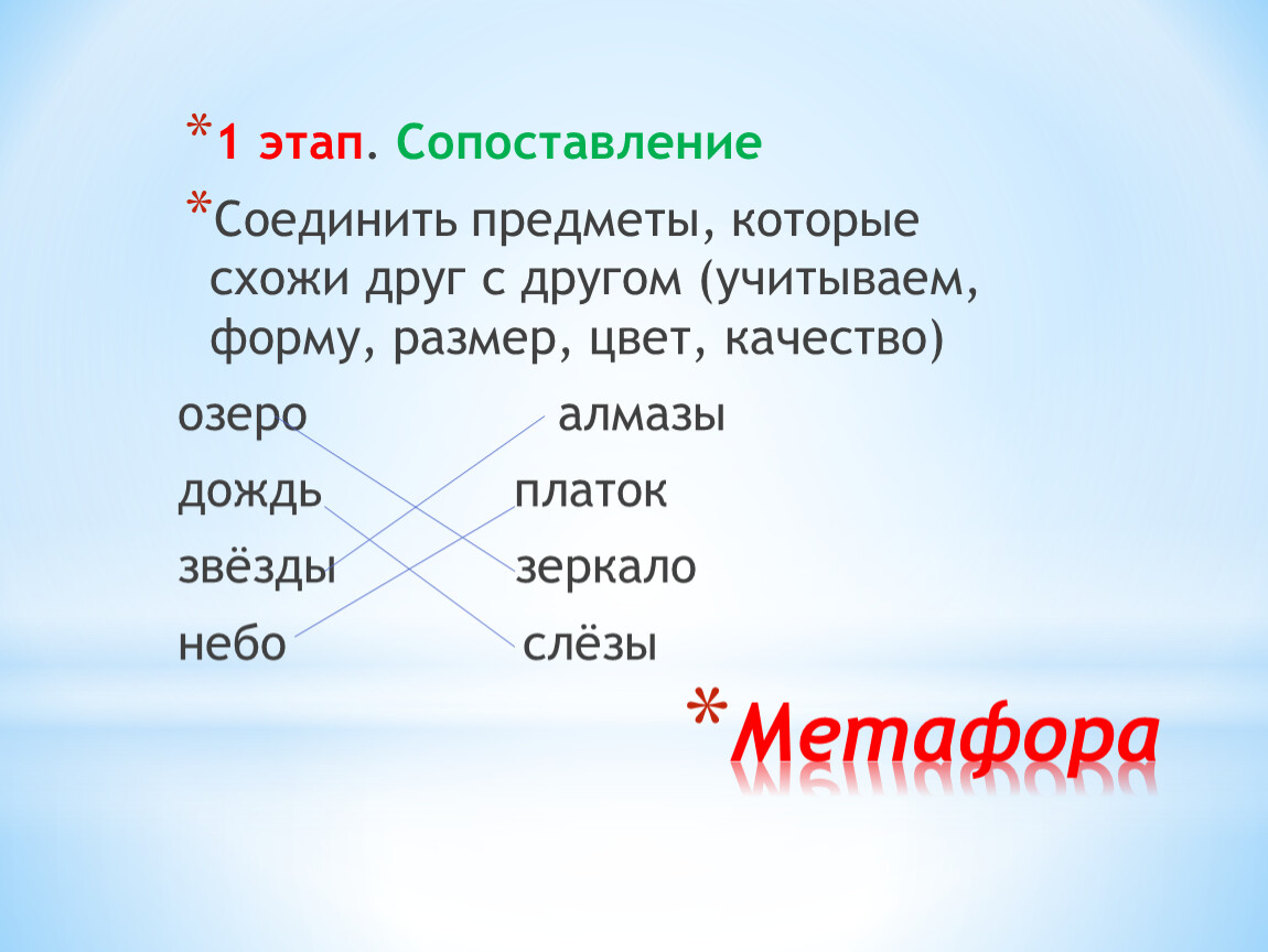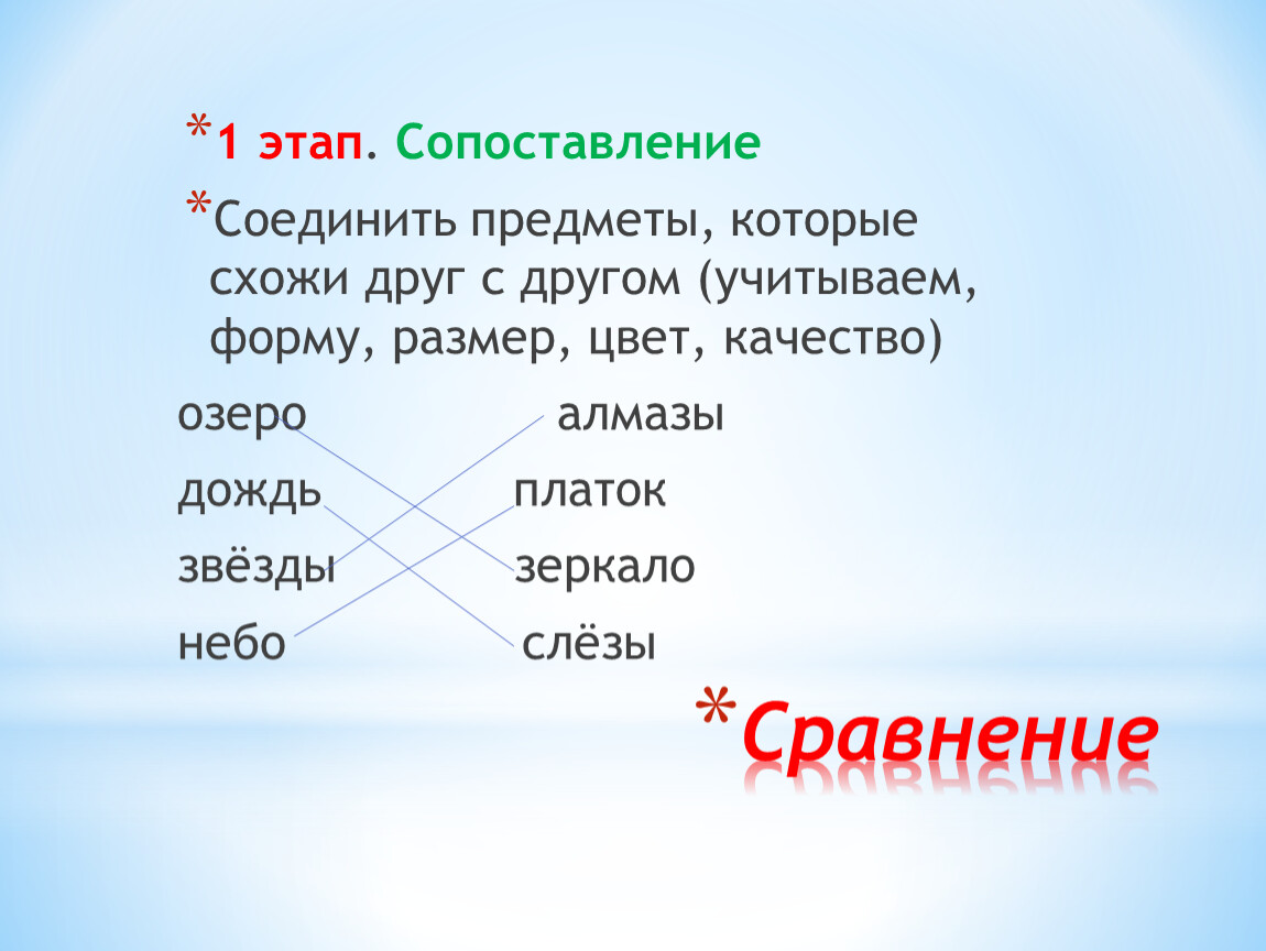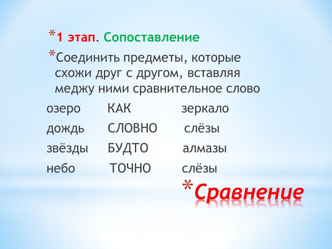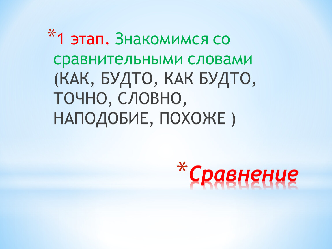 1 этап. Знакомимся со сравнительными словами (КАК, БУДТО, КАК БУДТО, ТОЧНО, СЛОВНО, НАПОДОБИЕ, ПОХОЖЕ )