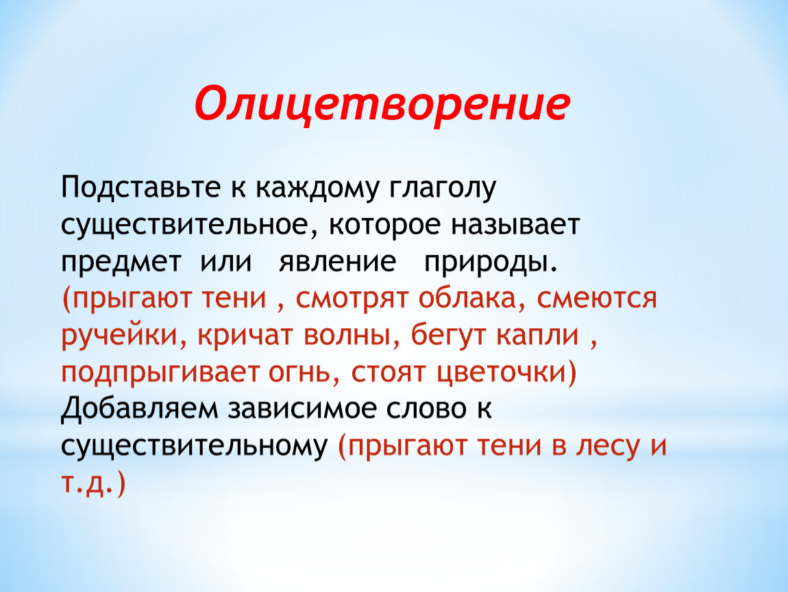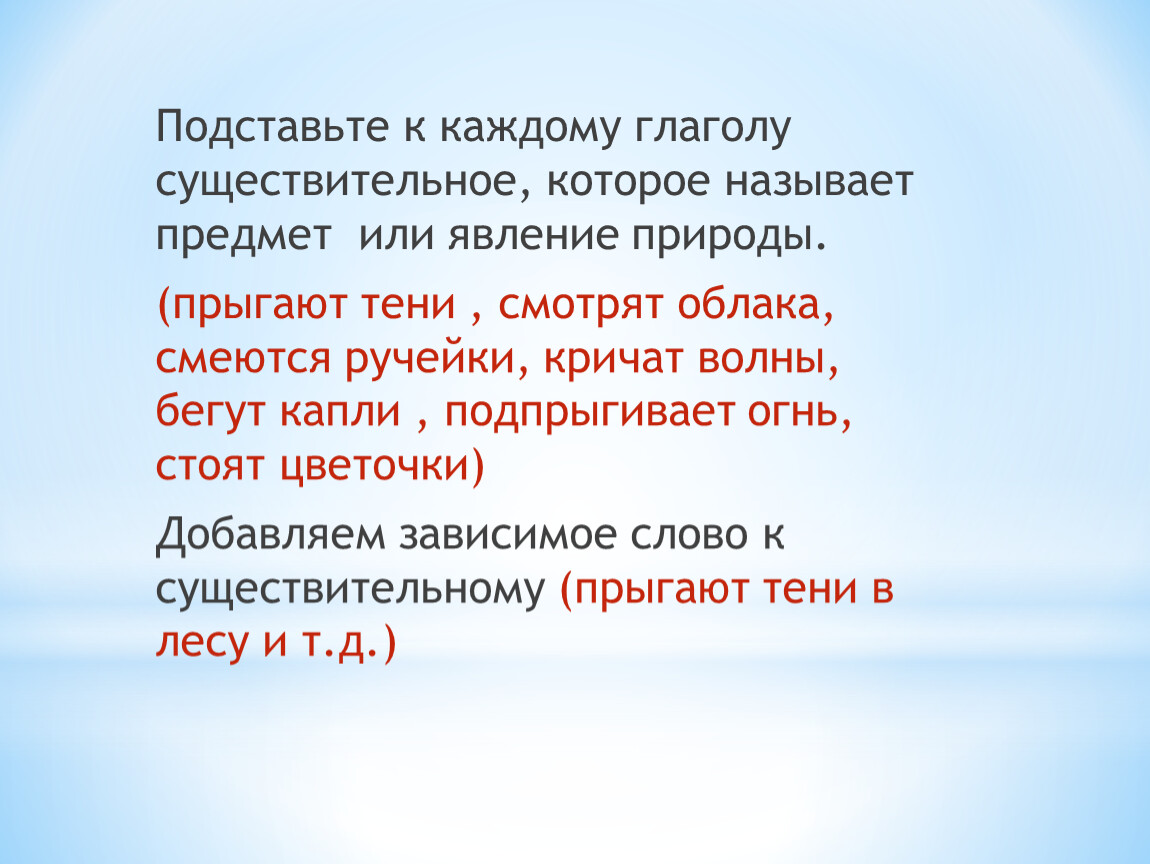 (прыгают тени , смотрят облака, смеются ручейки, кричат волны, бегут капли , подпрыгивает огнь, стоят цветочки)