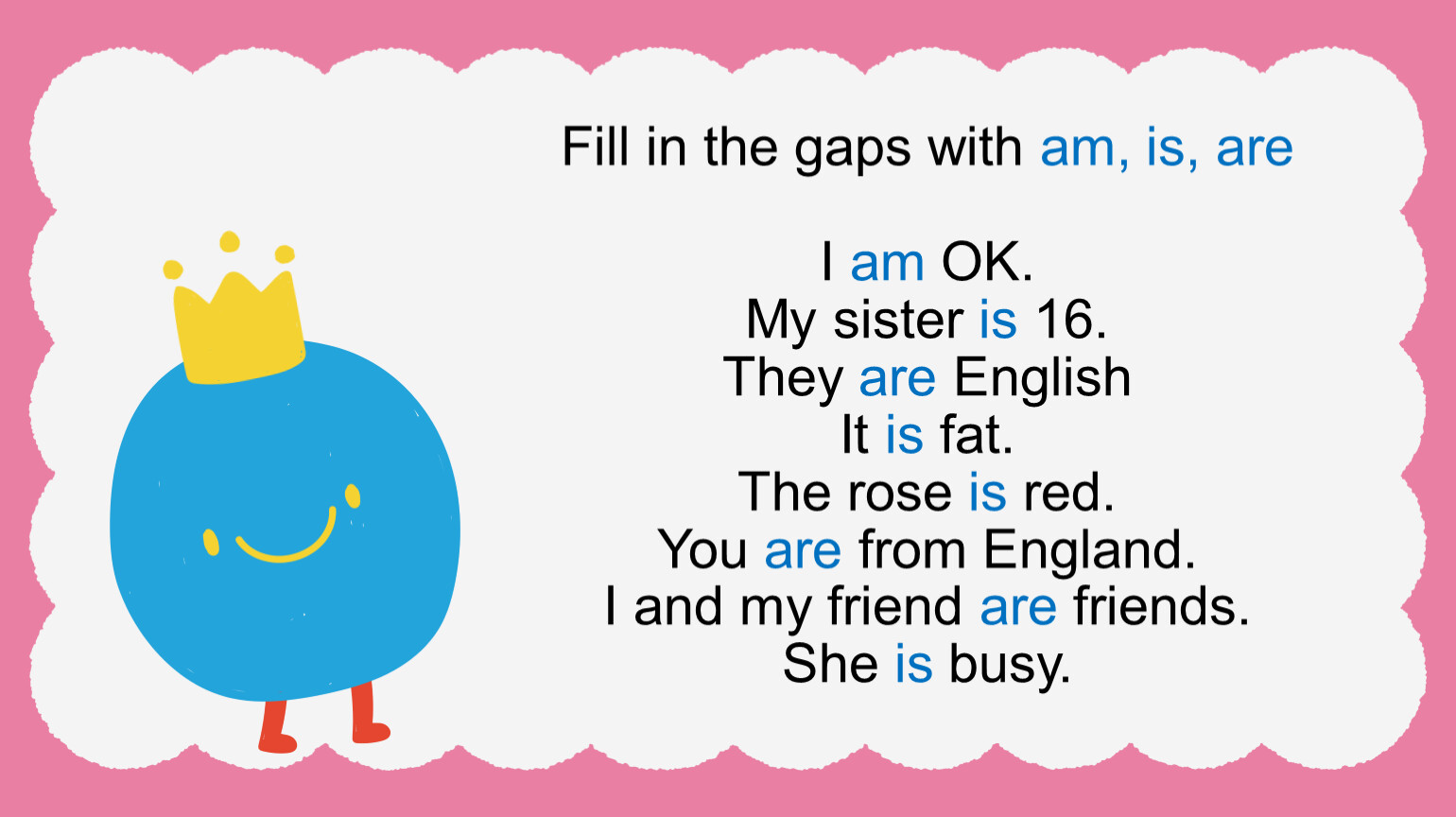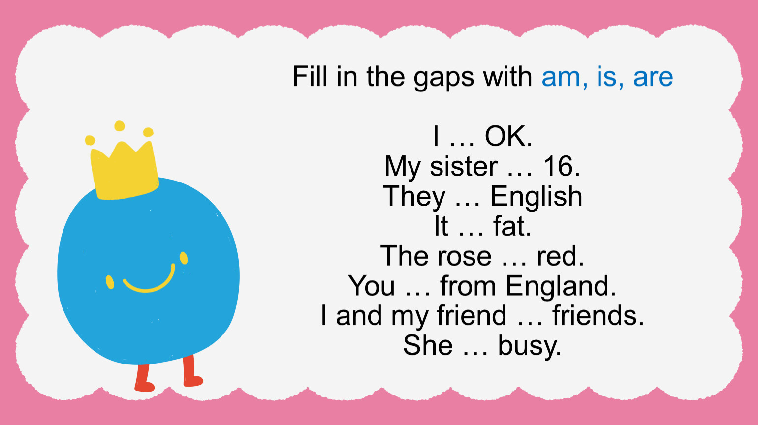 Fill in the gaps with am, is, areI am OK.My sister is 16.They are EnglishIt is fat.The rose is red.You are from England.I and my friend are friends.She is busy.