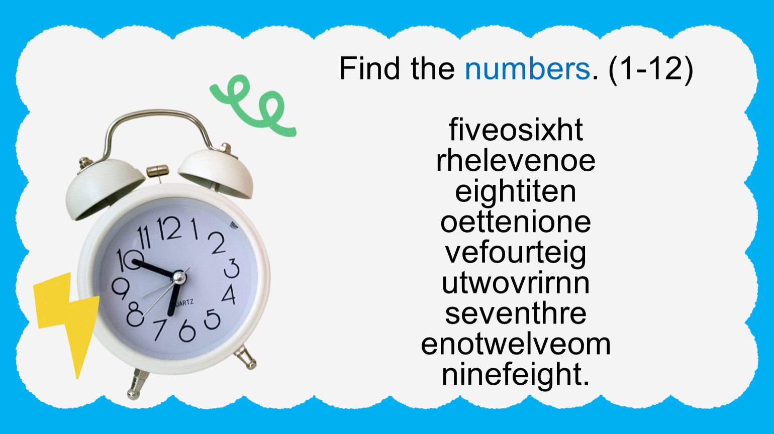 Find the numbers. (1-12) fiveosixhtrhelevenoeeightitenoettenionevefourteigutwovrirnnseventhreenotwelveomninefeight.