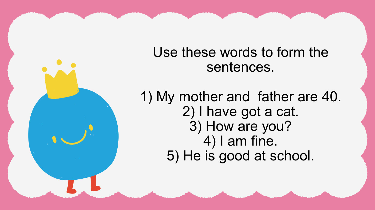 Use these words to form the sentences.1) are, my mother, 40, father, and.2) have, I, a cat, got.3) are, how, you? 4) am, I, fine.5) good, he, at, is, school.