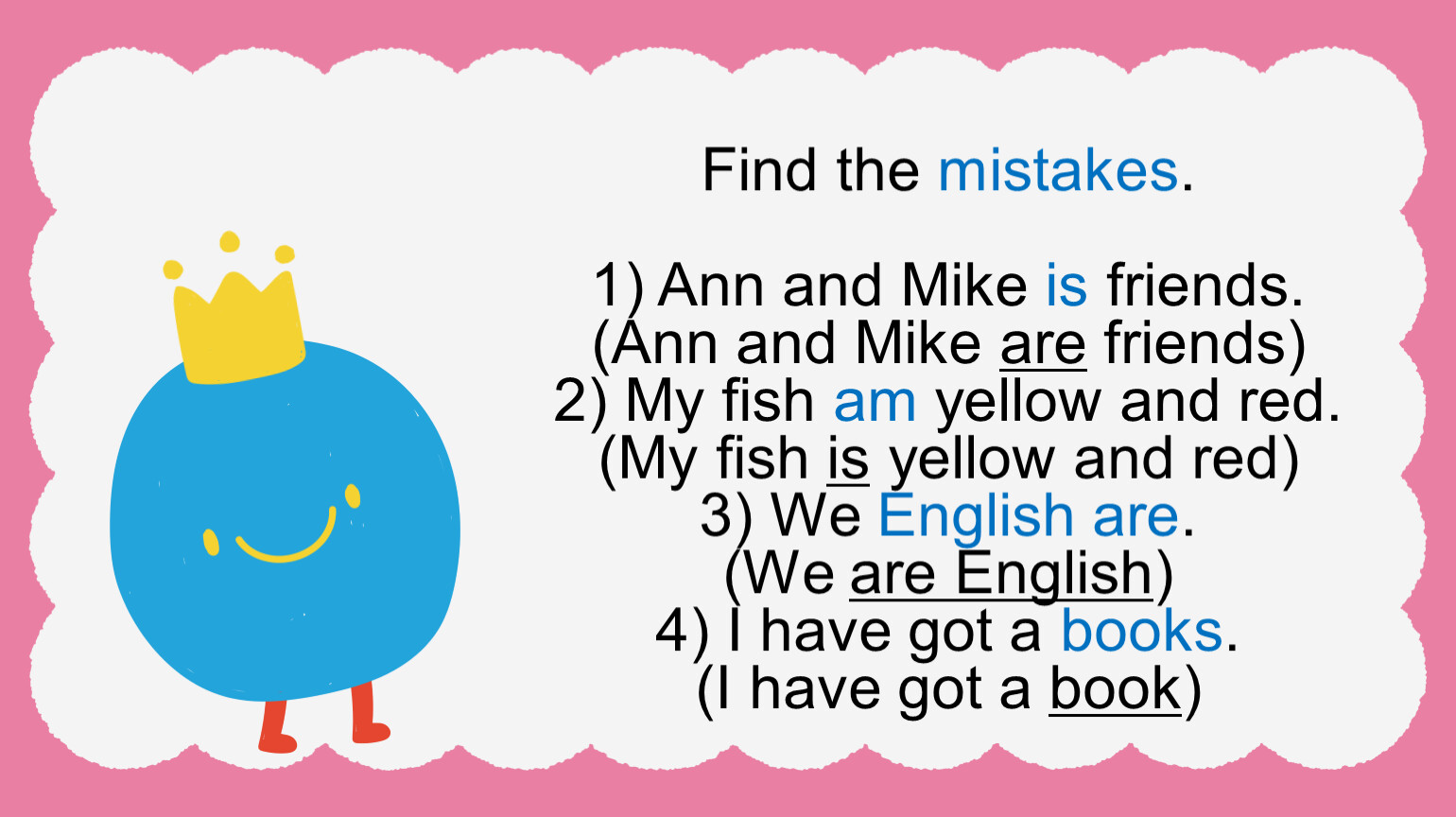 Find the mistakes.1) Ann and Mike is friends.2) My fish am yellow and red.3) We English are.4) I have got a books.