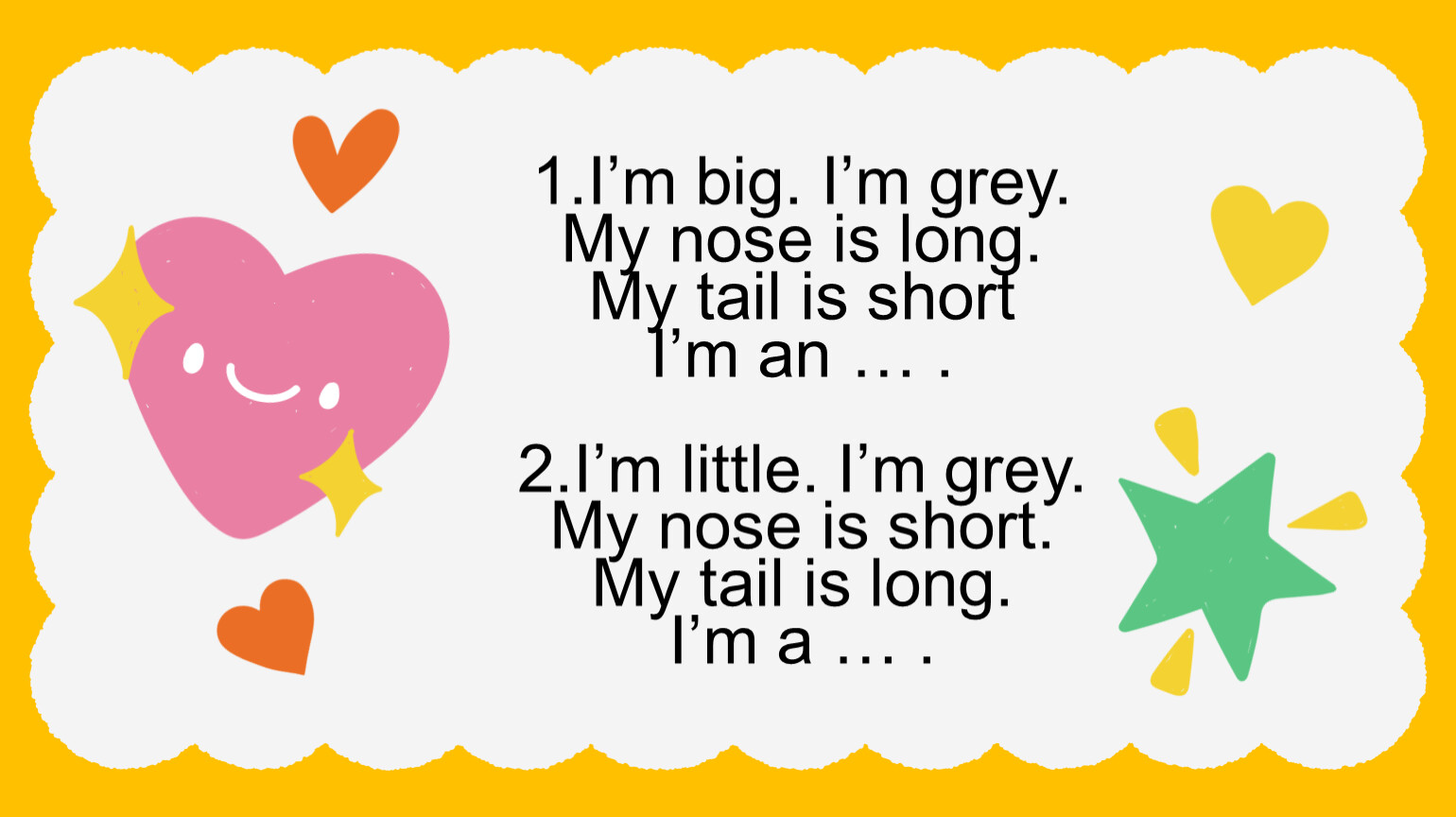 1.I’m big. I’m grey.My nose is long.My tail is shortI’m an … .2.I’m little. I’m grey.My nose is short.My tail is long.I’m a … .