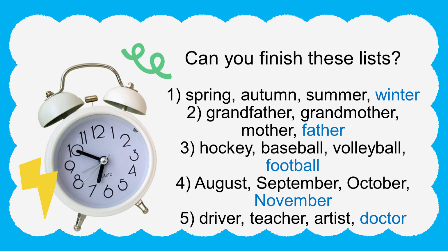 1) spring, autumn, summer, winter2) grandfather, grandmother, mother, father3) hockey, baseball, volleyball, football